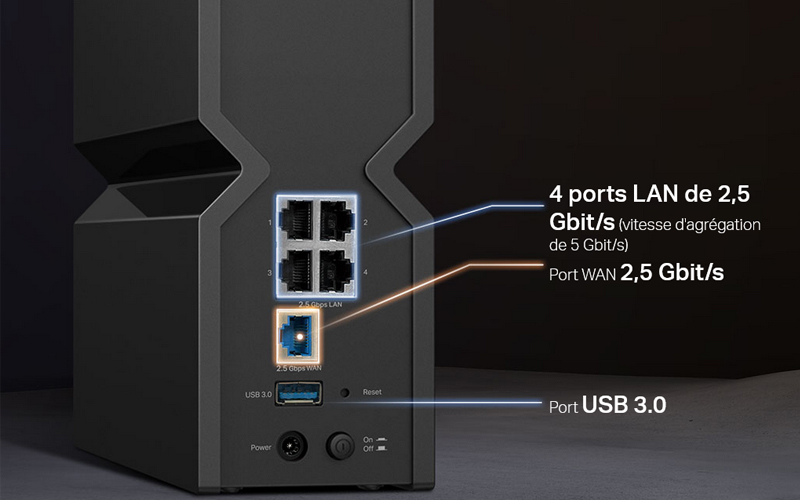 - 5 ports 2,5G : 1 port WAN 2,5 Gbit/s et 4 ports LAN 2,5 Gbit/s franchissent le goulot d'étranglement 1 G, propulsant vos appareils vers des performances optimales