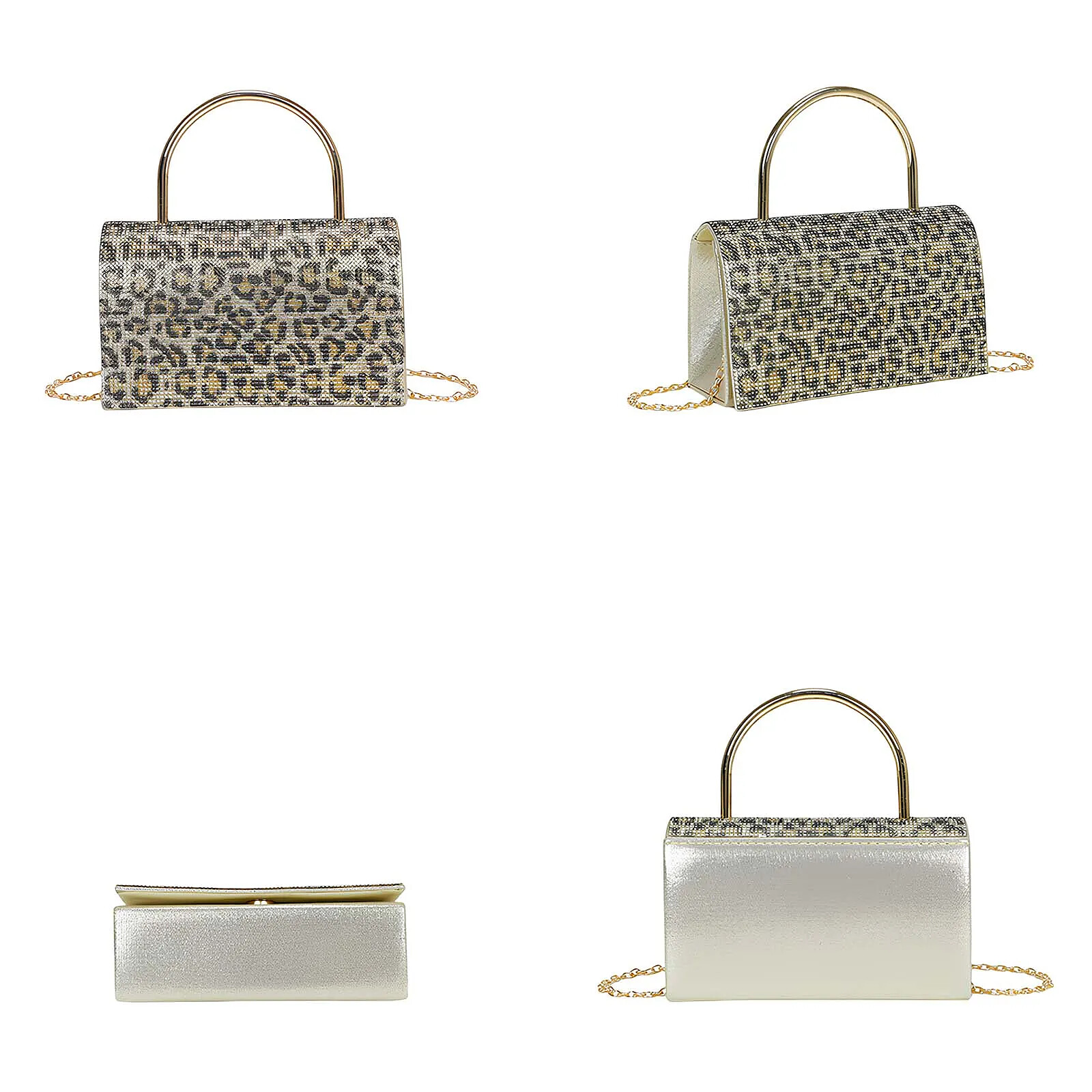 Ce sac à main de soirée doré met en avant un revêtement effet strass et une poignée métallique rigide pour un porté main élégant. La bandoulière chaîne amovible permet aussi un porté à l'épaule selon l'occasion. Le rabat se ferme par un bouton magnétique discret. L'intérieur doublé comprend un compartiment principal et une poche plate pour ranger smartphone, maquillage et essentiels de soirée.