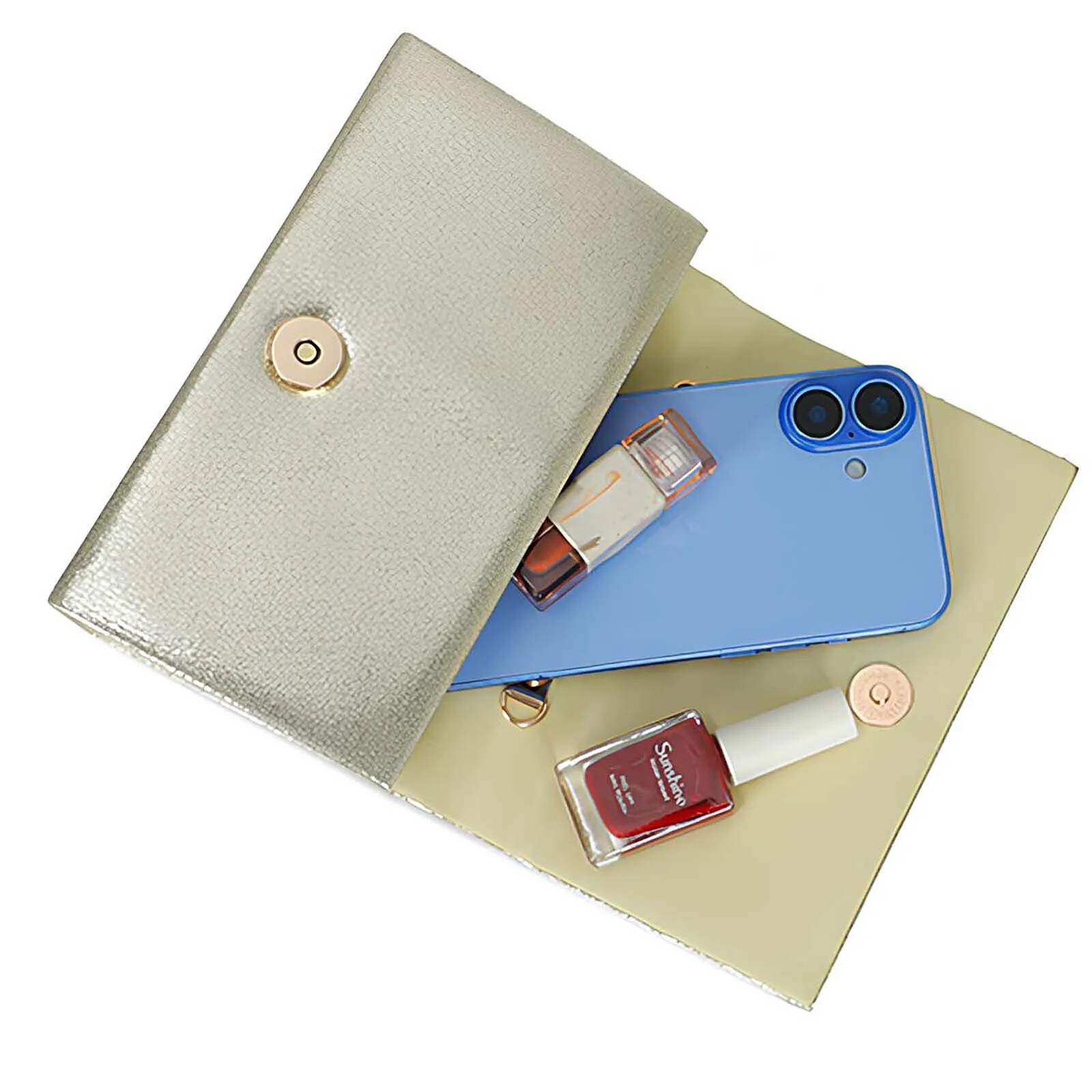 Le bouton magnétique sous le rabat maintient le sac fermé et limite les risques d'ouverture involontaire pendant la soirée