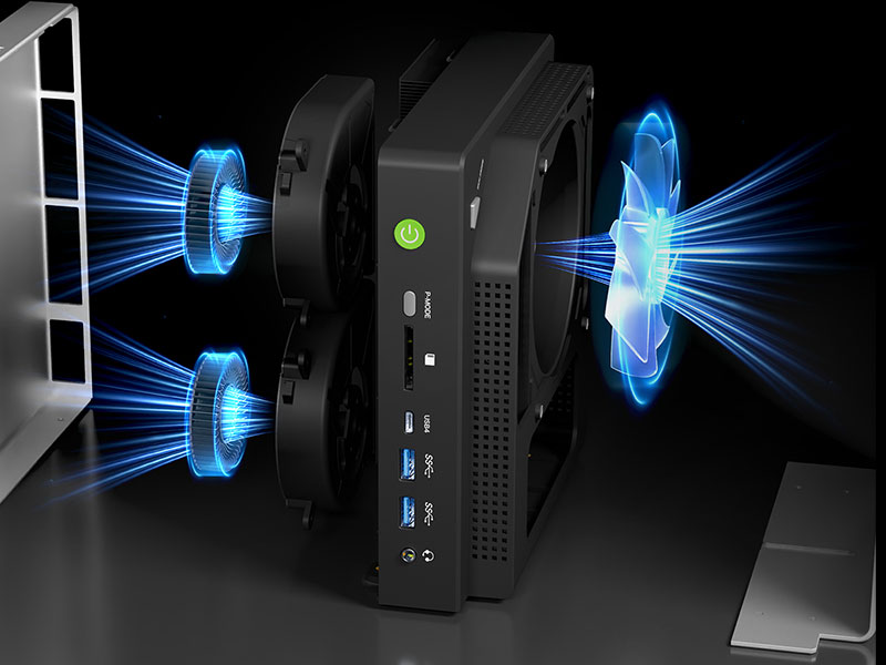 La gestion thermique repose sur une triple ventilation intelligente : 3 caloducs, 2 grands ventilateurs et des mini-ventilateurs RGB assurent un refroidissement actif optimisé, même en mode Turbo. Grâce à ses boutons physiques pour ajuster la lumière et changer de mode, l’EVO allie praticité et personnalisation et s’adapte à votre environnement de travail ou de jeu.