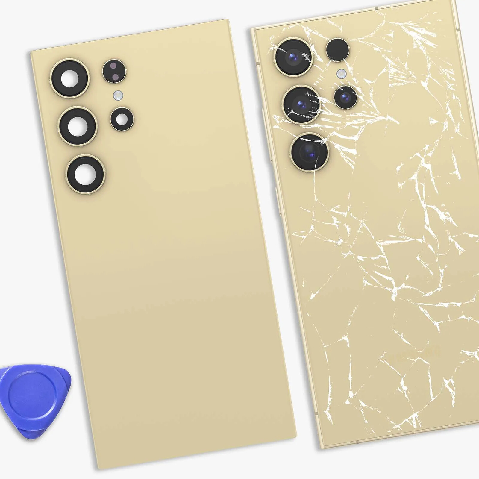 Cache batterie jaune conçu pour correspondre parfaitement au Galaxy S24 Ultra, permettant de restaurer l'apparence d'origine avec un ajustement précis et fiable lors de la pose