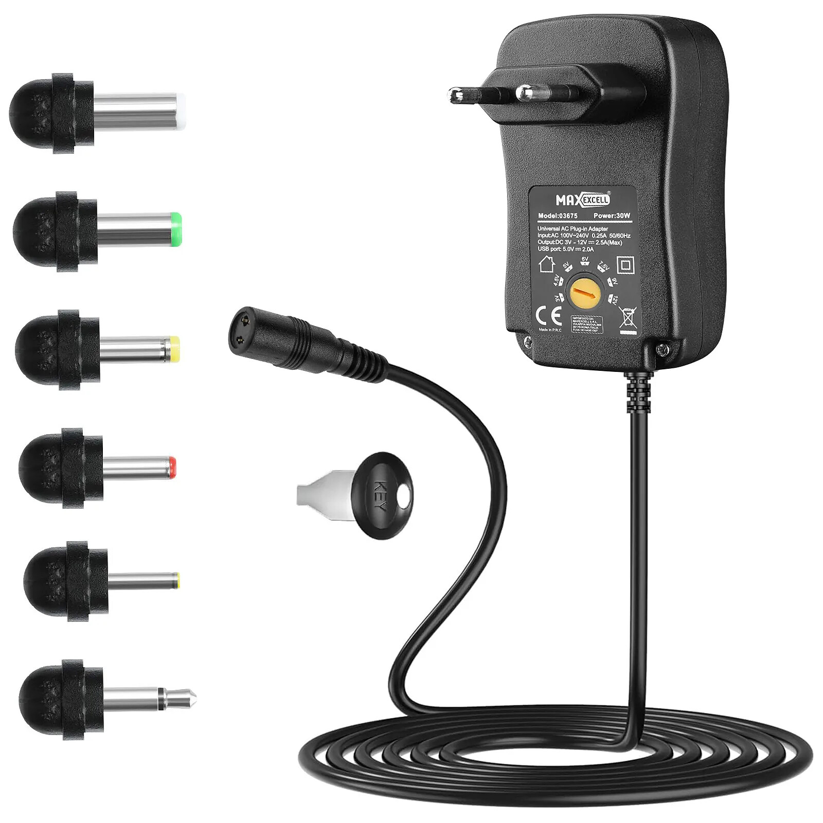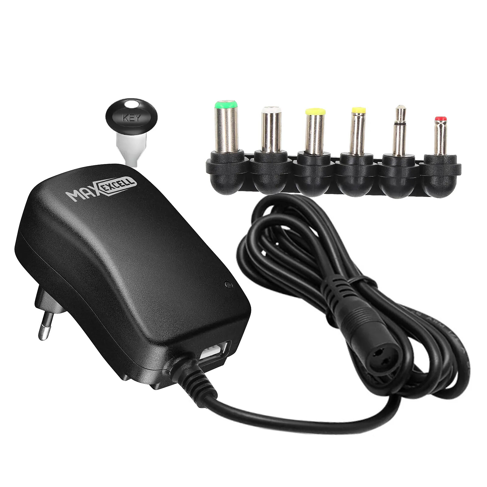 MAXEXCELL Chargeur Secteur 30W Tension Réglable 3-12V avec USB et 6 Embouts Inclus Noir |