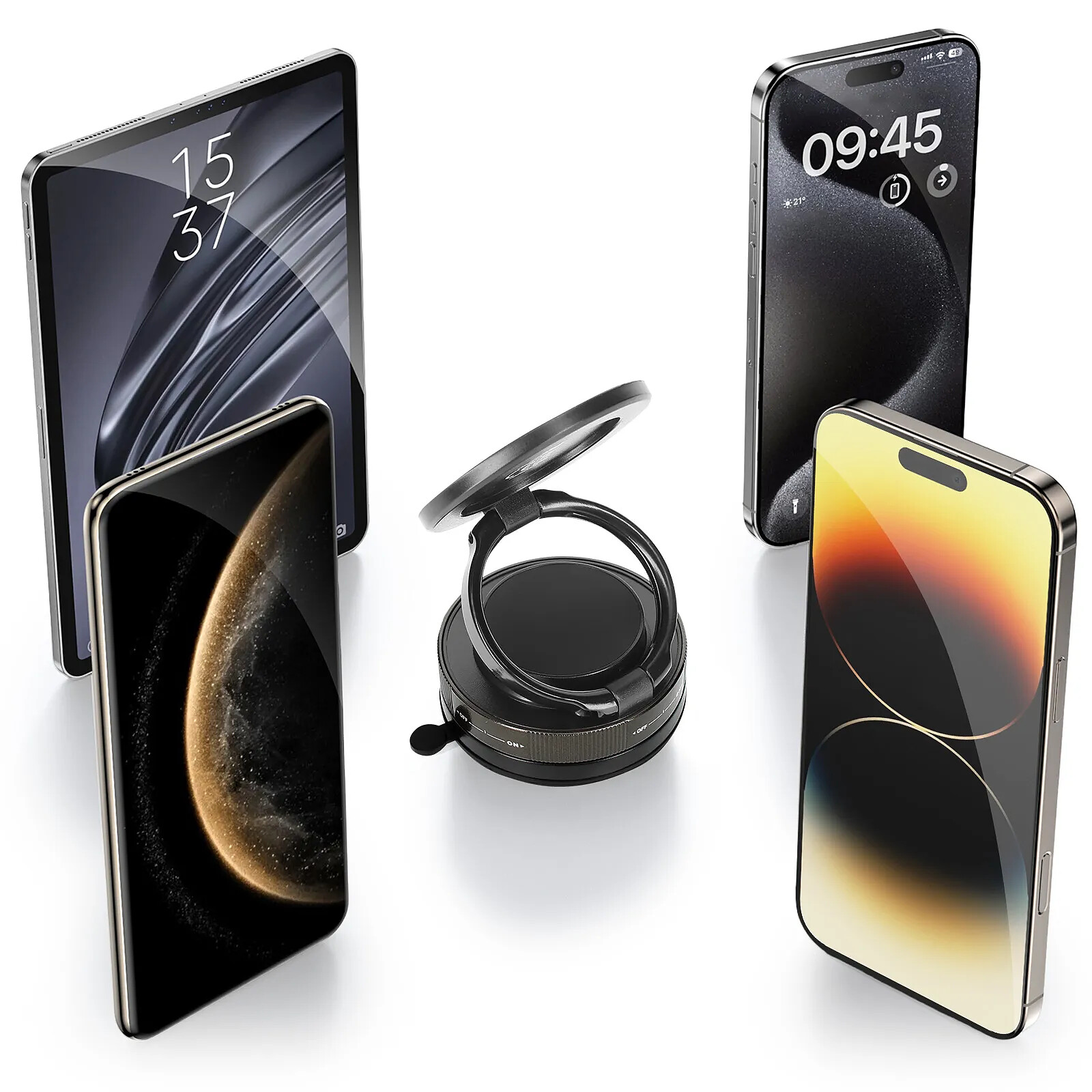 Support magnétique rotatif 360 avec ventouse puissante pour surface plane. Fixation stable sur tableau de bord, bureau, carrelage, verre ou métal. Tête orientable aimantée compatible avec tous smartphones munis d'une bague ou coque magnétique. Parfait pour un usage au bureau, en voiture, en cuisine ou salle de bain. Compact, repositionnable et facile à installer. Couleur noire. Marque LinQ.