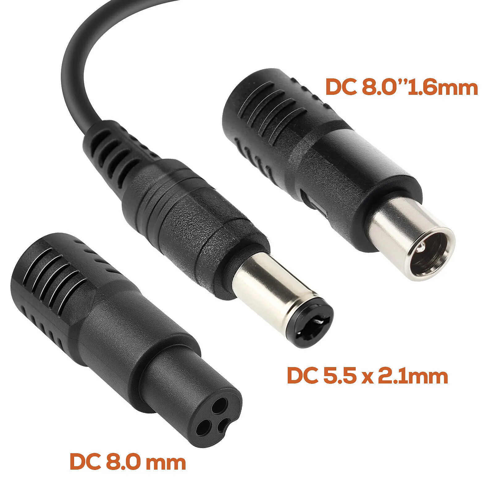 Chargeur secteur 84W pour trottinette électrique avec câble de 1,5 mètre. Comprend trois embouts interchangeables : DC 5,5 x 2,1 mm, 8,0 x 1,6 mm et 8 mm à 3 broches. Compatible avec plusieurs modèles de trottinettes Xiaomi, Ninebot et E-Twow. Permet de recharger rapidement votre batterie en toute sécurité. Prise secteur AC incluse. Format compact et pratique pour une utilisation quotidienne ou nomade.