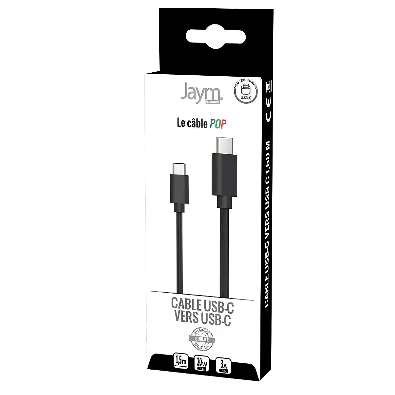 Câble de charge et synchronisation USB-C vers USB-C 60W de la collection POP par Jaym. Longueur 1,5 mètre pour plus de liberté au quotidien. Puissance de 3A 60W idéale pour charger rapidement smartphones tablettes ordinateurs ou consoles. Design noir simple et efficace. Emballage en carton écoresponsable.