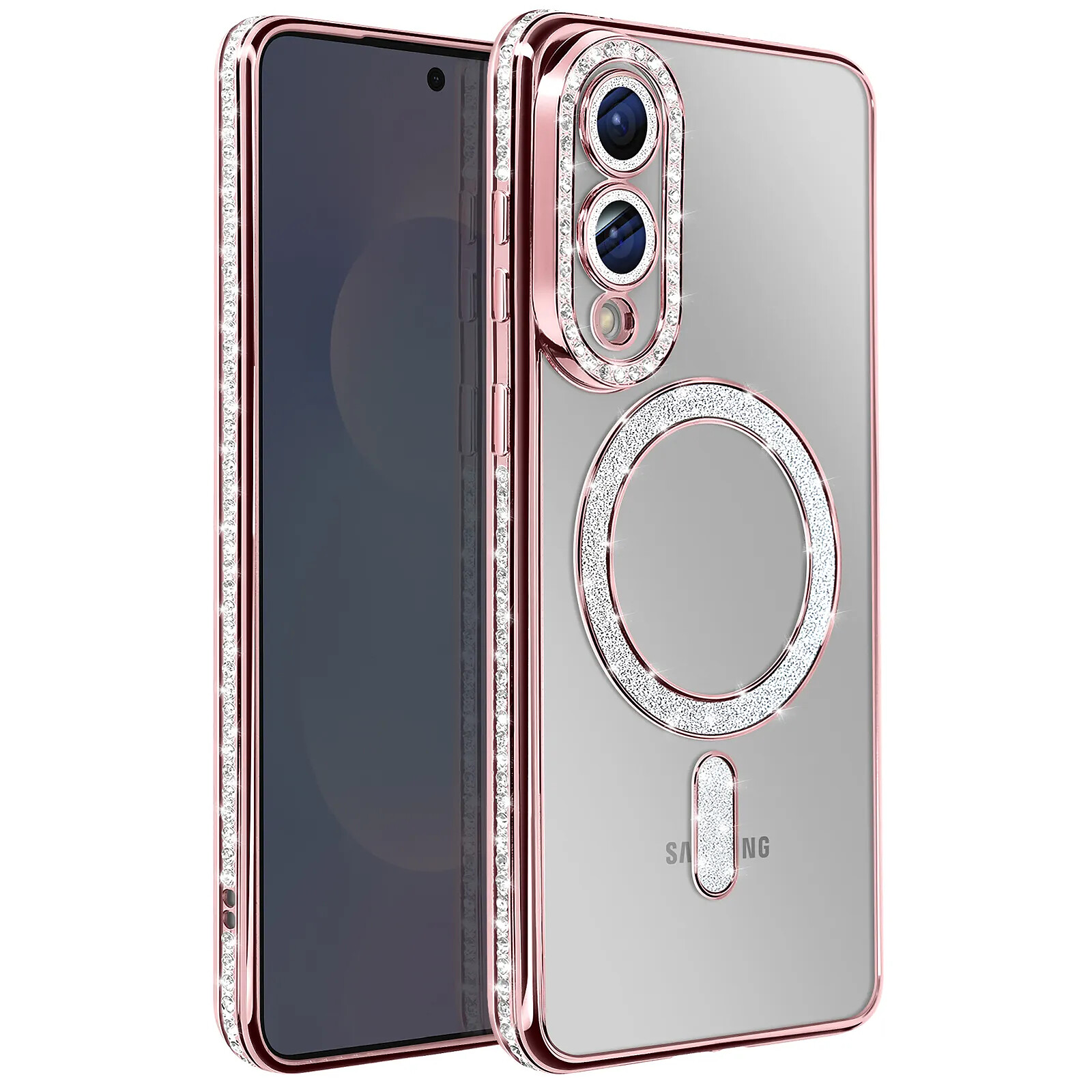 Offrez protection et élégance à votre Galaxy S25 Edge avec cette coque Diamant MagSafe. Conçue avec un contour rose champagne incrusté de strass scintillants et un bloc caméra renforcé, elle allie style et sécurité. Son anneau magnétique intégré permet une compatibilité avec les accessoires MagSafe. Transparente, elle met en valeur le design du téléphone tout en le protégeant contre les rayures, chocs et les chutes.
