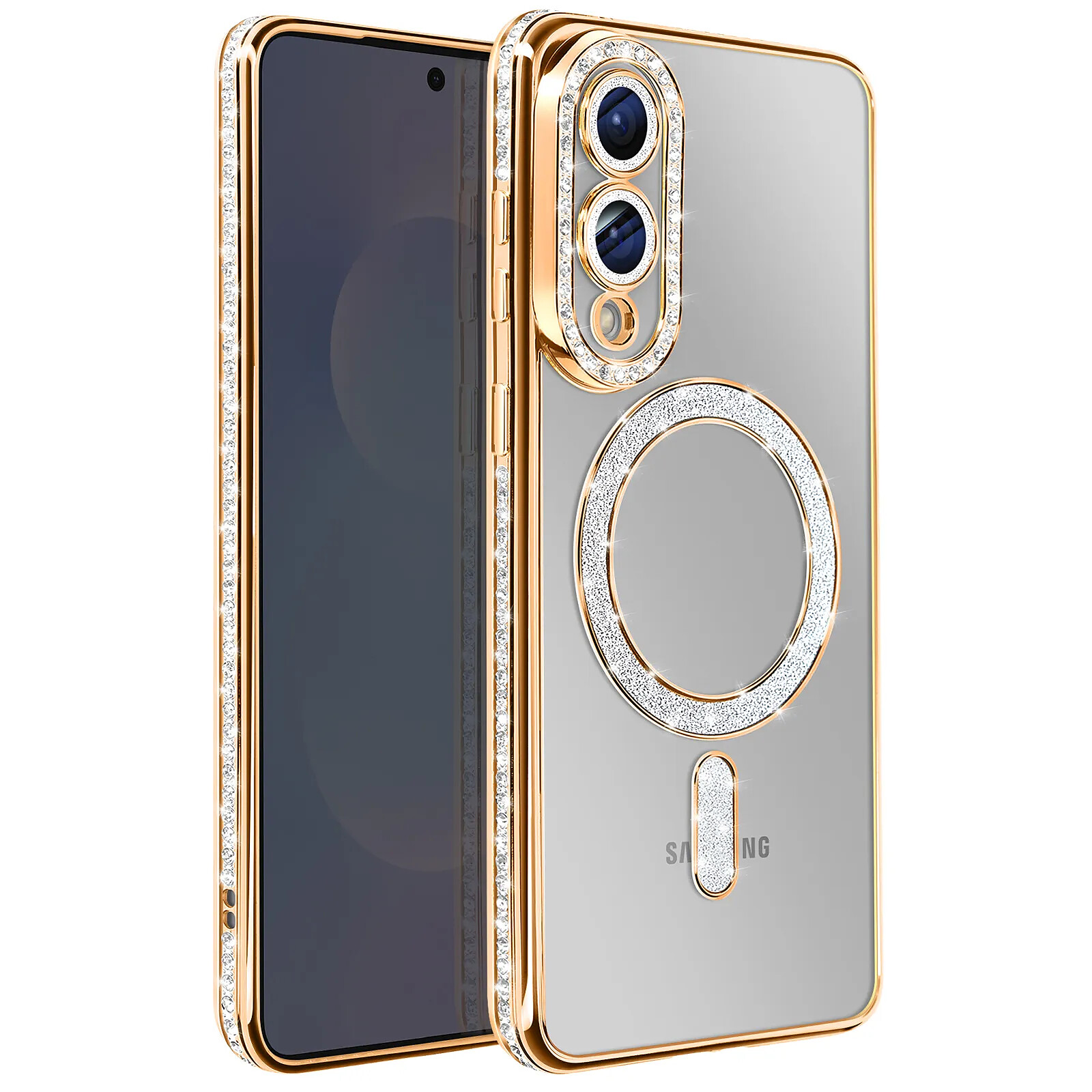 Avizar Coque pour Galaxy S25 Edge Compatible MagSafe avec Contour Strassé Dorée |