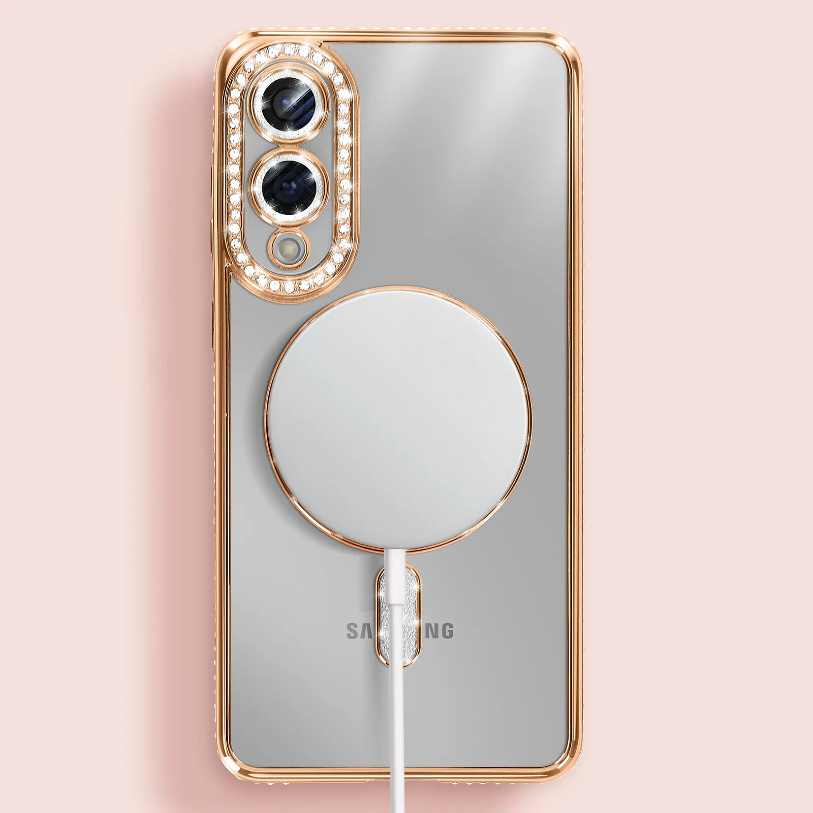 Offrez protection et élégance à votre Galaxy S25 Edge avec cette coque Diamant MagSafe. Conçue avec un contour doré incrusté de strass scintillants et un bloc caméra renforcé, elle allie style et sécurité. Son anneau magnétique intégré permet une compatibilité totale avec les accessoires MagSafe. Transparente, elle met en valeur le design du téléphone tout en le protégeant contre les rayures, chocs et les chutes.