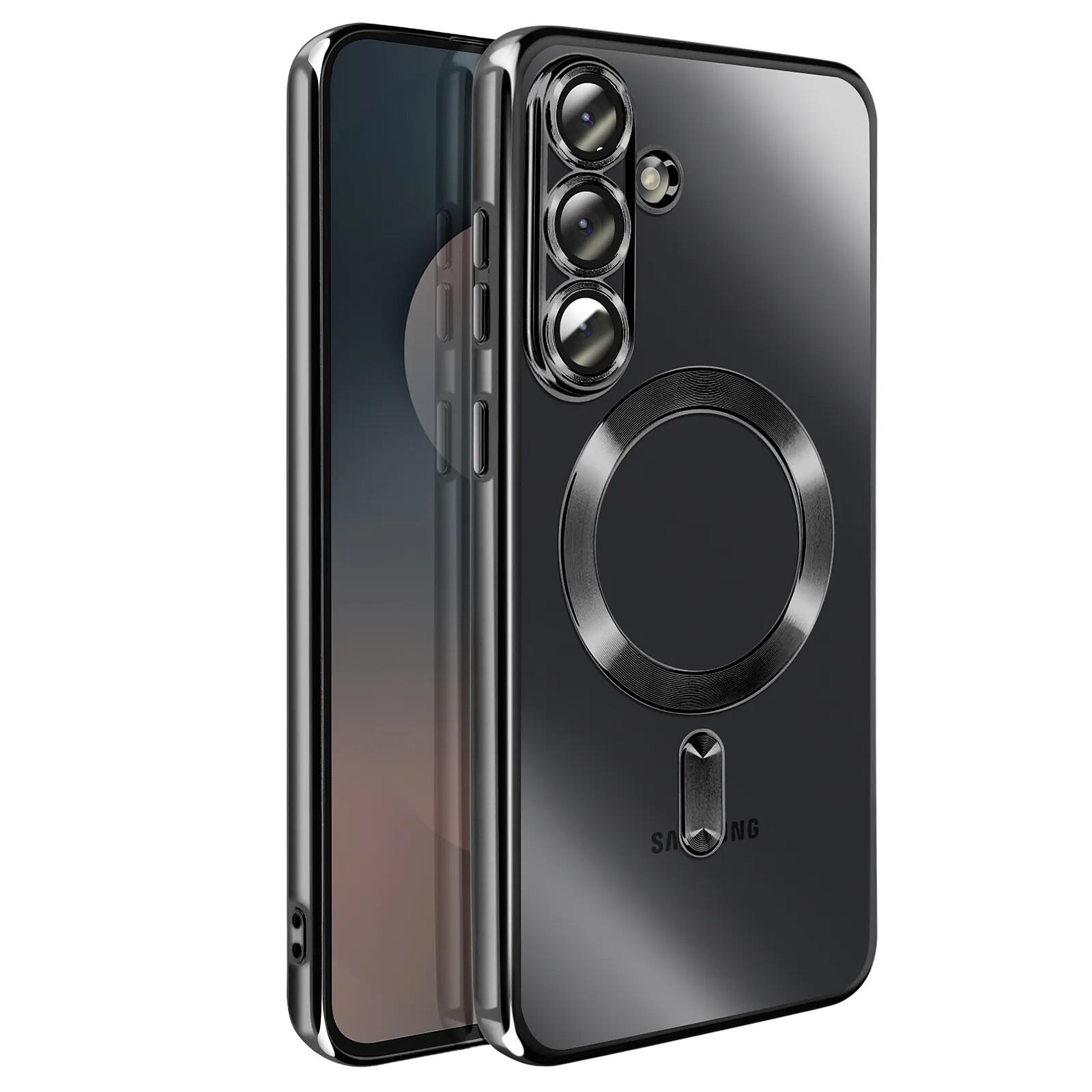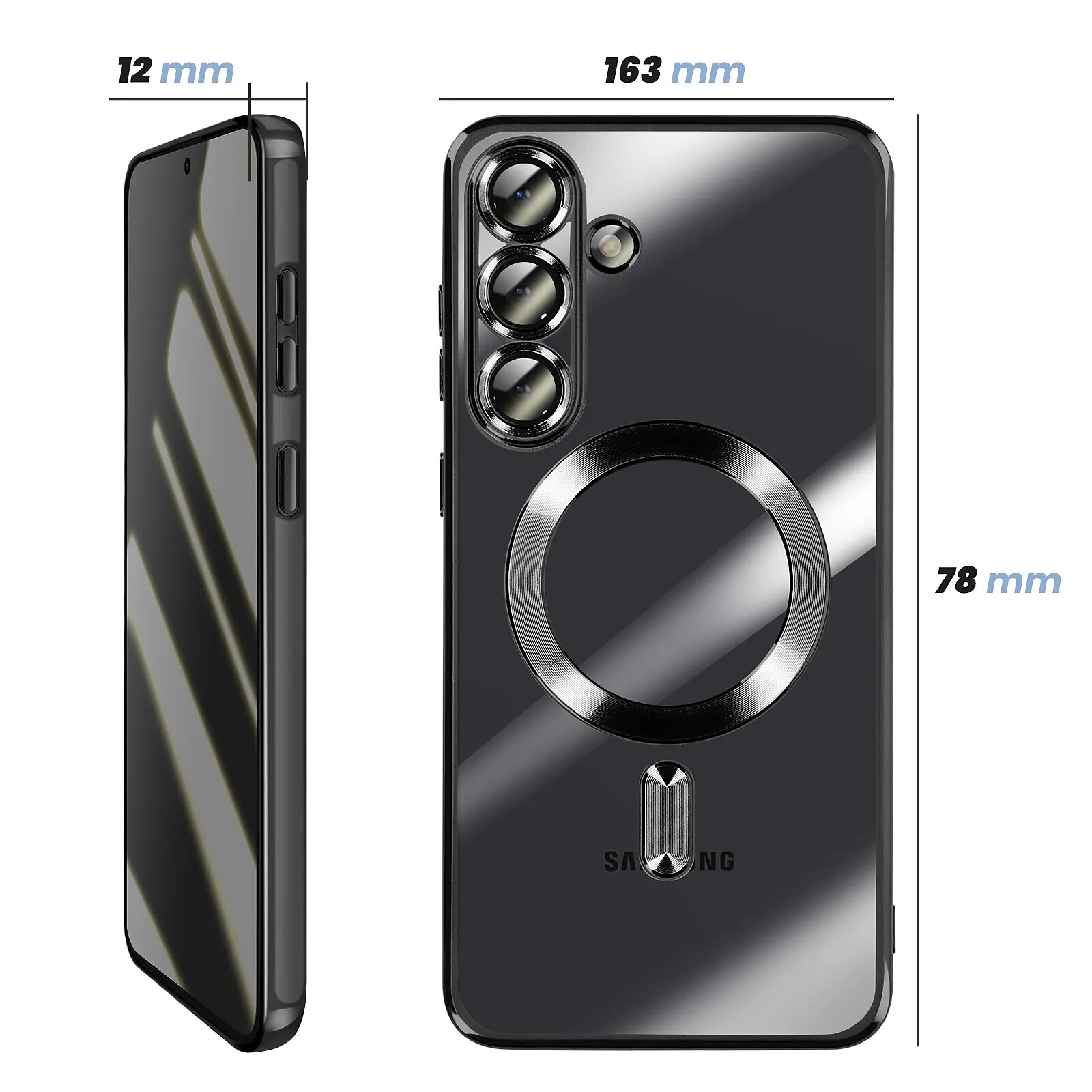 Cette coque pour Galaxy S25 FE associe un dos transparent en silicone et un contour chromé noir à finition brillante. Un anneau magnétique intégré permet la compatibilité avec les accessoires MagSafe et les supports magnétiques. Les lentilles sont protégées par des anneaux surélevés indépendants. Les découpes précises assurent l'accès aux ports, boutons et haut-parleurs, avec une grille anti-poussière intégrée.