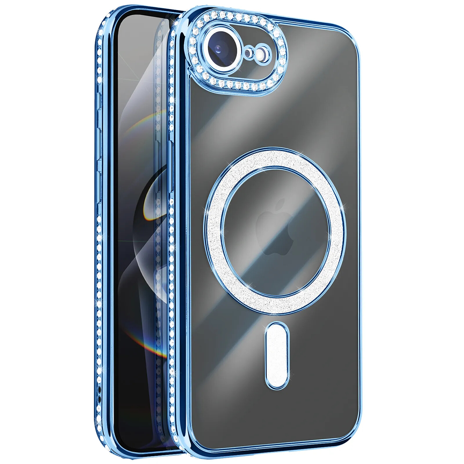 Offrez protection et élégance à votre iPhone 16e avec cette coque Diamant MagSafe. Conçue avec un contour bleu incrusté de strass scintillants et un bloc caméra renforcé, elle allie style et sécurité. Son anneau magnétique intégré permet une compatibilité totale avec les accessoires MagSafe. Transparente, elle met en valeur le design du téléphone tout en le protégeant contre les rayures, chocs et les chutes.