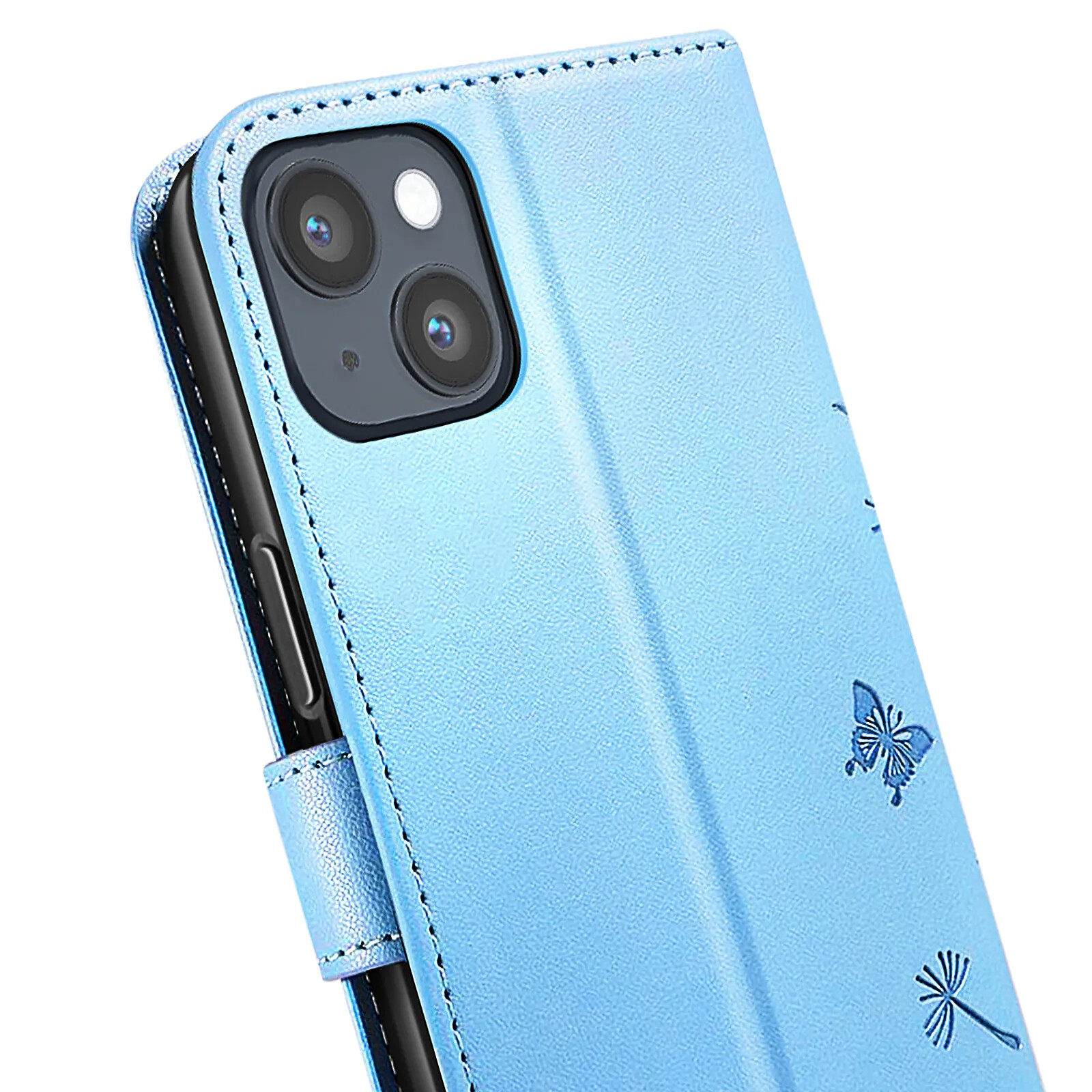 Protégez votre iPhone 13 / 14 avec élégance grâce à cet étui portefeuille Zanaé bleu clair. Son similicuir haut de gamme est décoré d'un motif pissenlit et papillon gravé pour un style raffiné. Il offre une protection complète avec coque intérieure souple, fermeture magnétique, rangements pour cartes et billets, ainsi qu'un support vidéo pratique pour vos contenus multimédia.
