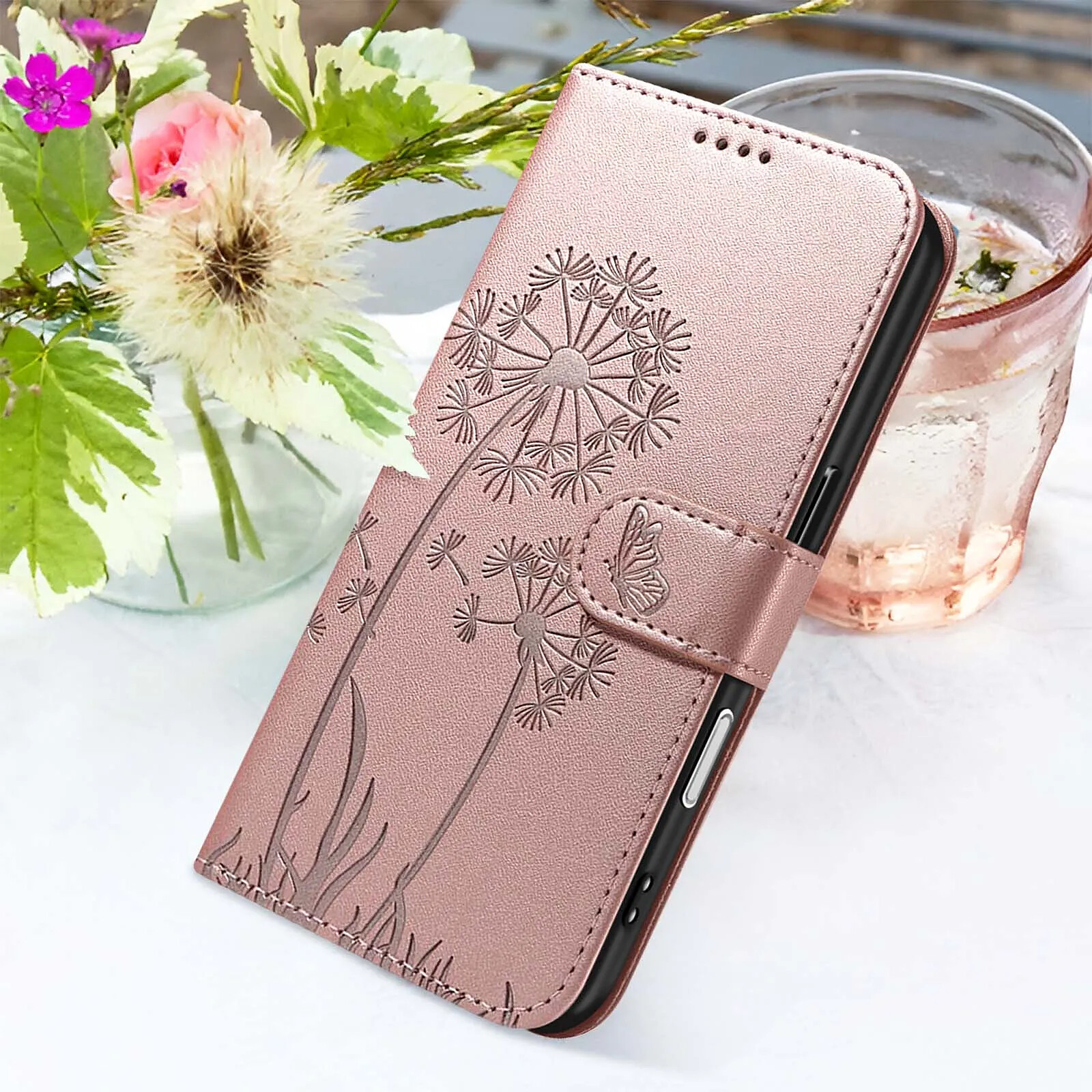 Étui au motif pissenlit gravé avec papillon en relief pour une protection esthétique et originale de votre smartphone