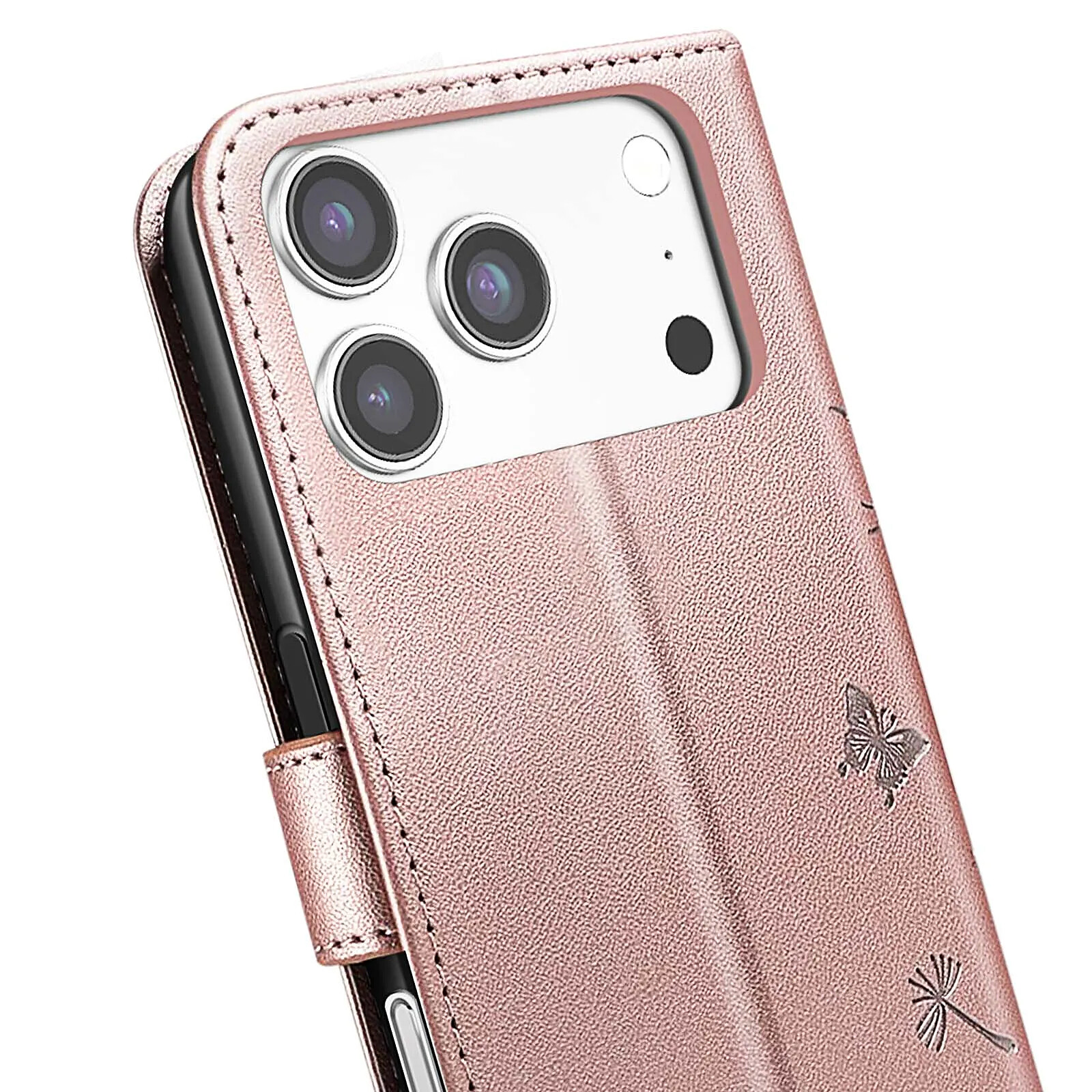 Protégez votre iPhone 17 Pro Max avec élégance grâce à cet étui portefeuille Zanaé rose champagne. Son similicuir haut de gamme est décoré d'un motif pissenlit et papillon gravé pour un style raffiné. Il offre une protection complète avec coque intérieure souple, fermeture magnétique, rangements pour cartes et billets, ainsi qu'un support vidéo pratique pour vos contenus multimédia.