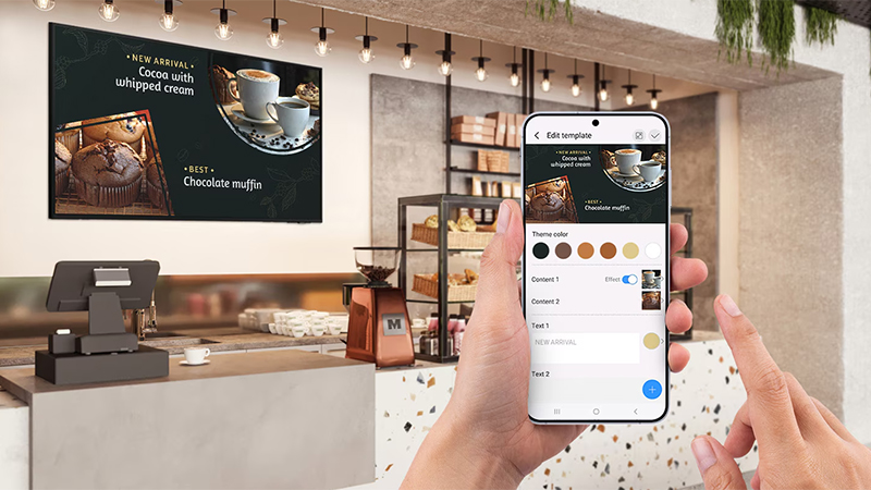Avec l’application Samsung Business TV, disponible sur Android et iOS, vous pouvez facilement créer et gérer le contenu de votre écran TV professionnel. De plus, l'application vous permet de choisir parmi 100 modèles pré-enregistrés : des ventes saisonnières, des promotions, des gestes barrières, des menus... Rajoutez vos propres photos pour créer un contenu à votre image.