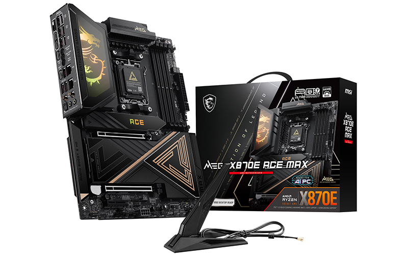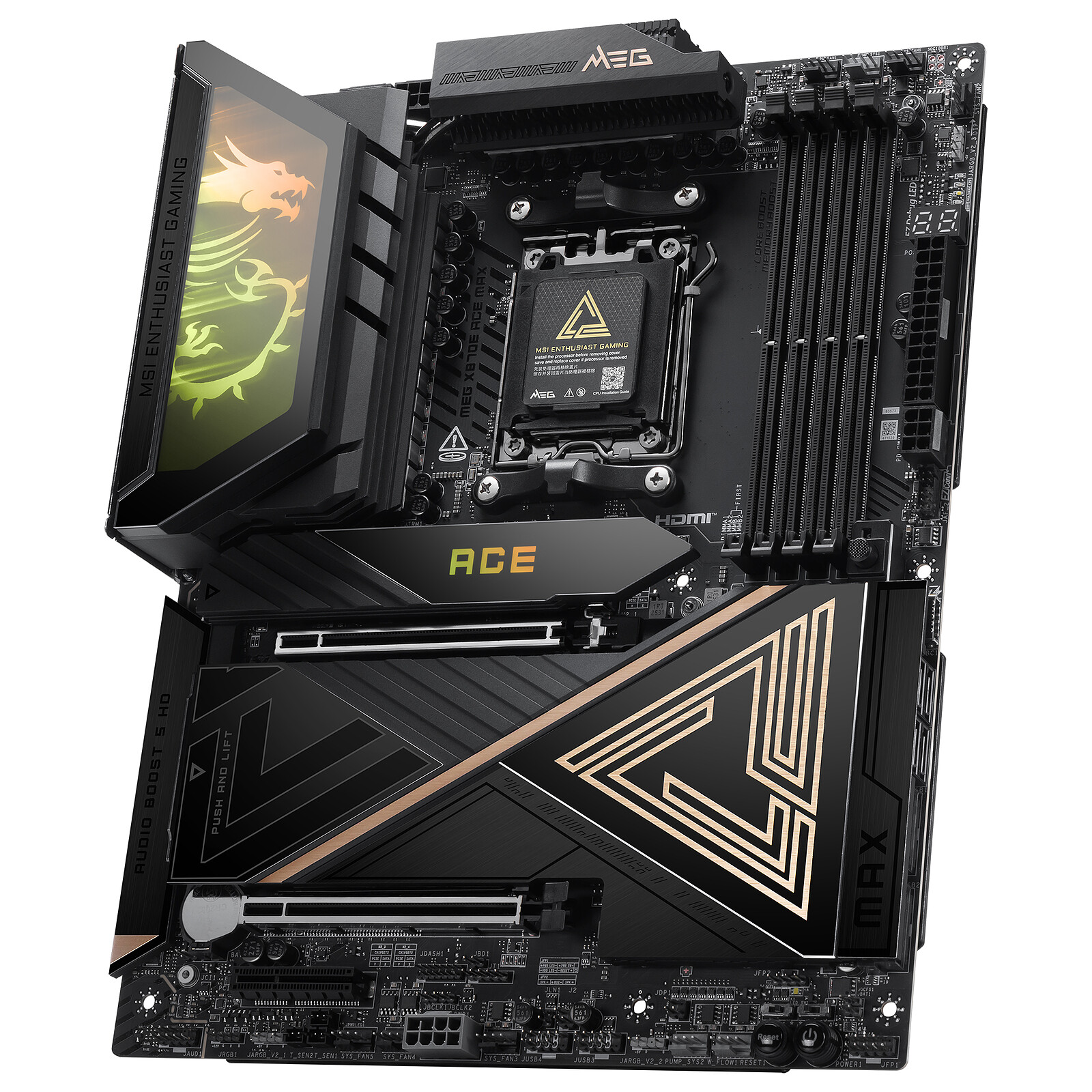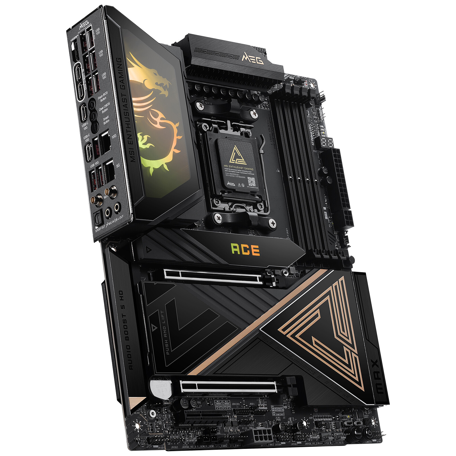 La carte mère MSI MEG X870E ACE MAX est un modèle haut de gamme conçu pour les configurations gaming de performance extrême. Conçue autour du chipset AMD X870E et du socket AM5, elle accueille les processeurs AMD Ryzen 9000 / 8000 / 7000 Series et offre une plateforme complète pour exploiter au maximum les dernières technologies gaming, de connectivité et d’extension. Elle bénéficie notamment d'une connectivité réseau ultra-rapide (10G + 5G LAN, Wi-Fi 7), de ports USB4 haut débit, de multiples interfaces PCIe 5.0 et d’un support mémoire DDR5 optimisé.