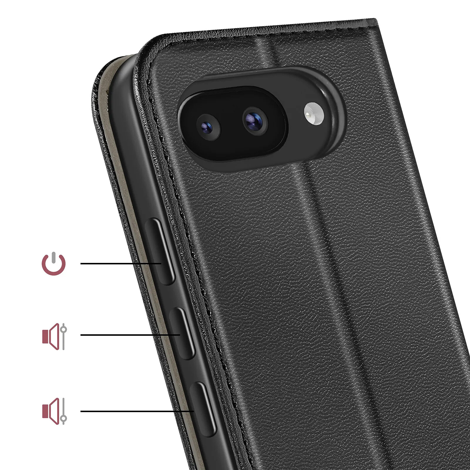 Cet étui pour Google Pixel 10a présente un revêtement externe en simili cuir noir à effet légèrement grainé