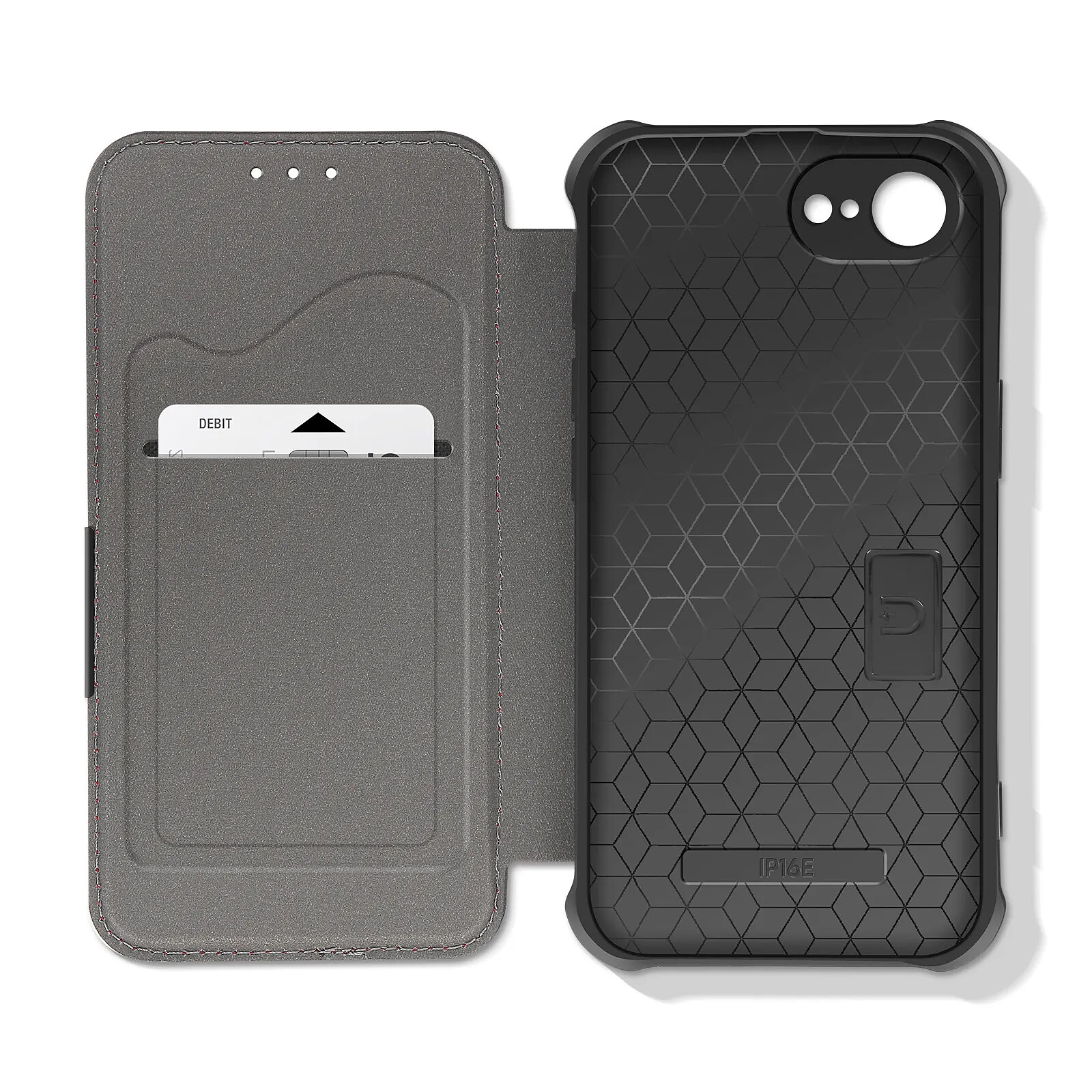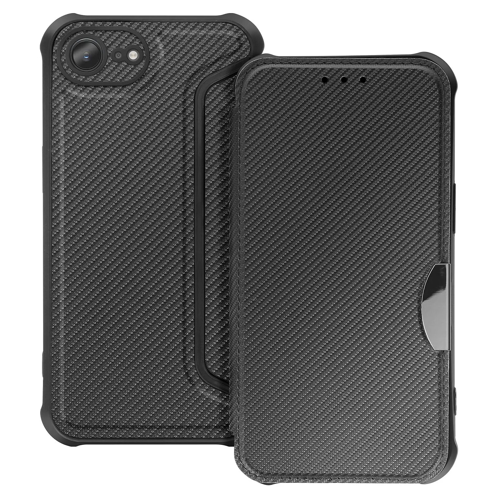Étui clapet carbone conçu pour iPhone 17e offrant une protection renforcée au quotidien. Son revêtement en simili cuir finition carbone apporte un style moderne et élégant. La coque interne avec structure nid d'abeille et coins renforcés absorbe efficacement les chocs. Le clapet magnétique protège l'écran et intègre un compartiment carte pratique pour un usage quotidien.