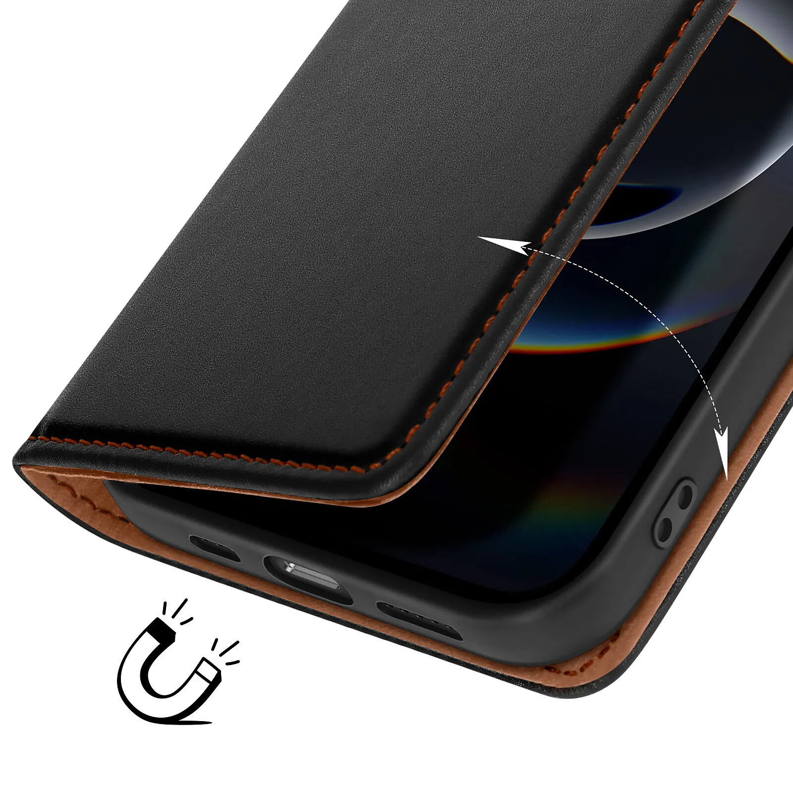 Étui portefeuille en cuir véritable conçu pour iPhone 17e offrant une protection complète du smartphone. Son rabat aimanté sécurise l'écran tout en protégeant contre les chocs et les rayures. L'intérieur doux préserve l'écran tandis que la coque interne souple maintient parfaitement l'appareil. Un compartiment carte est intégré et le rabat se transforme en support vidéo pour un visionnage mains libres.