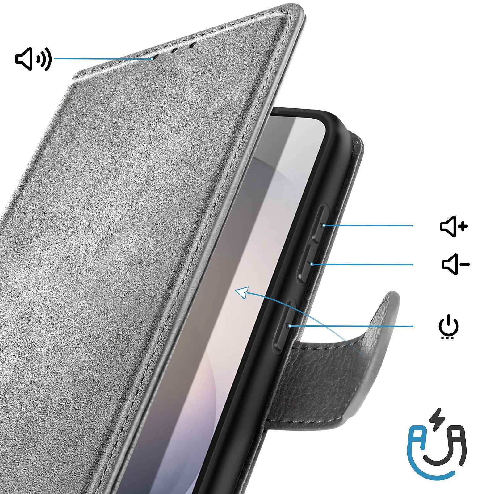 Cet étui portefeuille gris pour Galaxy S26 présente une finition Chesterfield à surface grainée. Deux fentes verticales dans le rabat maintiennent cartes bancaires et badges, tandis qu'un compartiment latéral glisse des billets ou reçus à plat. La coque rigide en polycarbonate bloque fermement le smartphone et protège le module photo. Le rabat pliable forme un support stable pour vidéos et appels visio.
