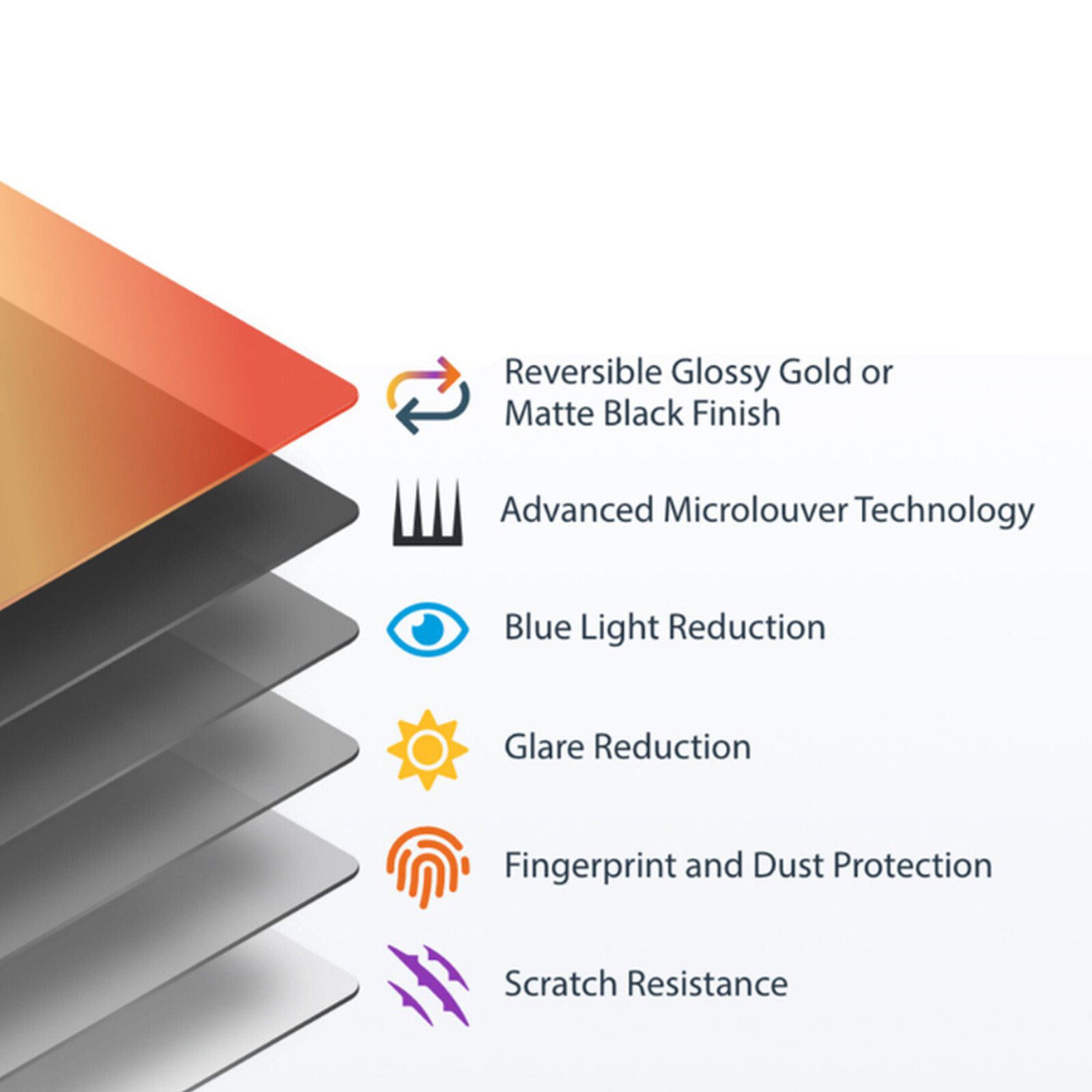 - Filtre double face : Bouclier de sécurité avec face dorée brillante pour une confidentialité maximale et face mate antireflet avec un revêtement résistant aux rayures et aux empreintes digitales
