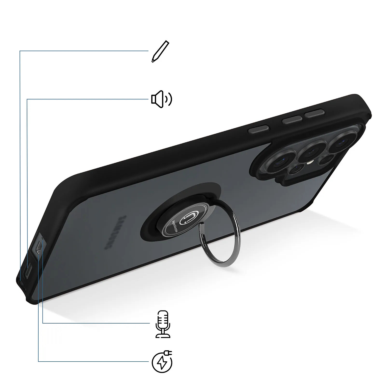 Cette coque pour Galaxy S26 Ultra combine un dos rigide givré en polycarbonate transparent et une bordure noir en TPU à absorption d'impact. L'anneau métallique arrière, rotatif à 360°, intègre un insert ferromagnétique compatible avec les supports magnétiques de voiture. Le rebord surélevé protège le module photo, tandis que l'anneau sert aussi de support stable pour vidéos et appels visio.