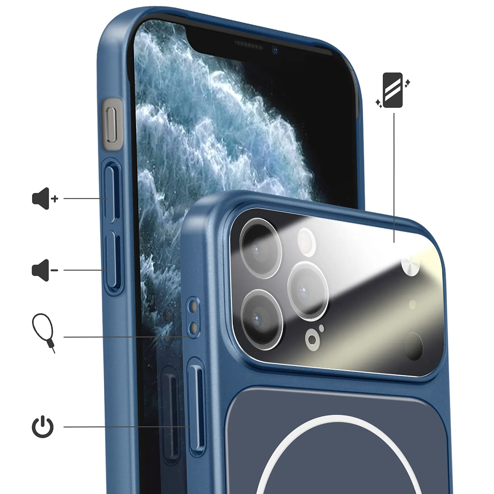 Cette coque bleu nuit pour iPhone 11 Pro Max associe protection et design élégant. Son dos rigide avec finition mate type AG Glass offre un aspect verre tout en limitant les traces de doigts. L'anneau magnétique intégré permet l'utilisation d'accessoires compatibles MagSafe et la recharge sans fil. Le verre protecteur intégré couvrant le module caméra contribue à protéger le module photo sans gêner les prises de vue.
