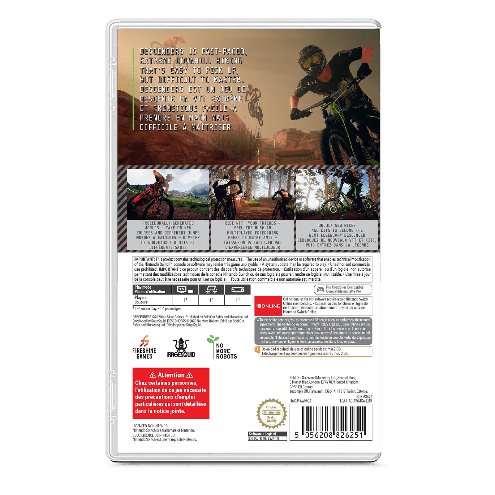 Allez-vous mener votre équipe à la victoire et devenir le prochain Descender de légende ? Code de Téléchargement Uniquement. Ne contient pas de cartouche de jeu ! Description Découvrez Descenders, un jeu de descente VTT extrême Mondes générés de façon procédurale : Les sauts et pentes changent à chaque partie. Contrôles libres : Contrôlez avec précision chaque mouvement de votre cycliste grâce au moteur physique conçu pour des whips et scrubs fluides. Risque et récompense : Foncez pour un gros score et des combos de ouf -- mais tombez trop souvent et vous perdrez tout ! Dominez les classements : Un système de réputation en ligne pour mettre en valeur vos exploits ainsi que gagner de nouveaux vélos et équipements. Bande originale sous licence : Associés au label drum & bass Liquicity pour vous apporter la bande son idéale pour dévaler la montagne Devenez le prochain Descender : Pourrez-vous survivre pendant une session complète, et devenir un Descender de Légende ? ÉDITEUR FireshineGENRE Action, Sport, CourseSUPPORT Jeu vidéo en code de téléchargementPLATEFORME Nintendo SwitchLANGUES en Français, Anglais, Allemand, Espagnol, Italien, Portugais, NéerlandaisPACK en Français, AnglaisCLASSE D'ÂGE PEGI 3 Informations RSGP