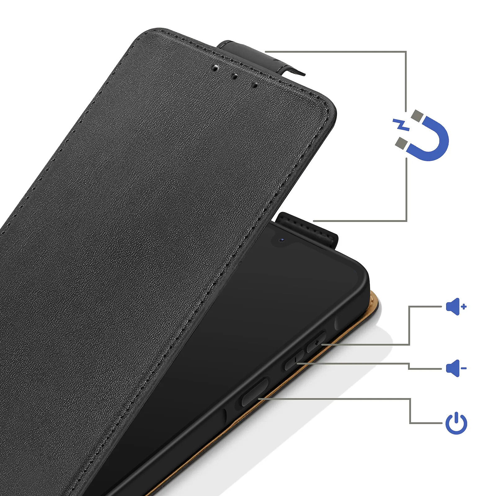 Alliez protection et praticité avec cet étui clapet vertical pour Samsung Galaxy A57. Sa coque interne en silicone aide à absorber les chocs tandis que le revêtement en similicuir apporte une finition élégante. Le rabat avec porte-cartes intégré garde l'essentiel à portée de main. Double fermeture magnétique et fonction support pour un usage confortable.