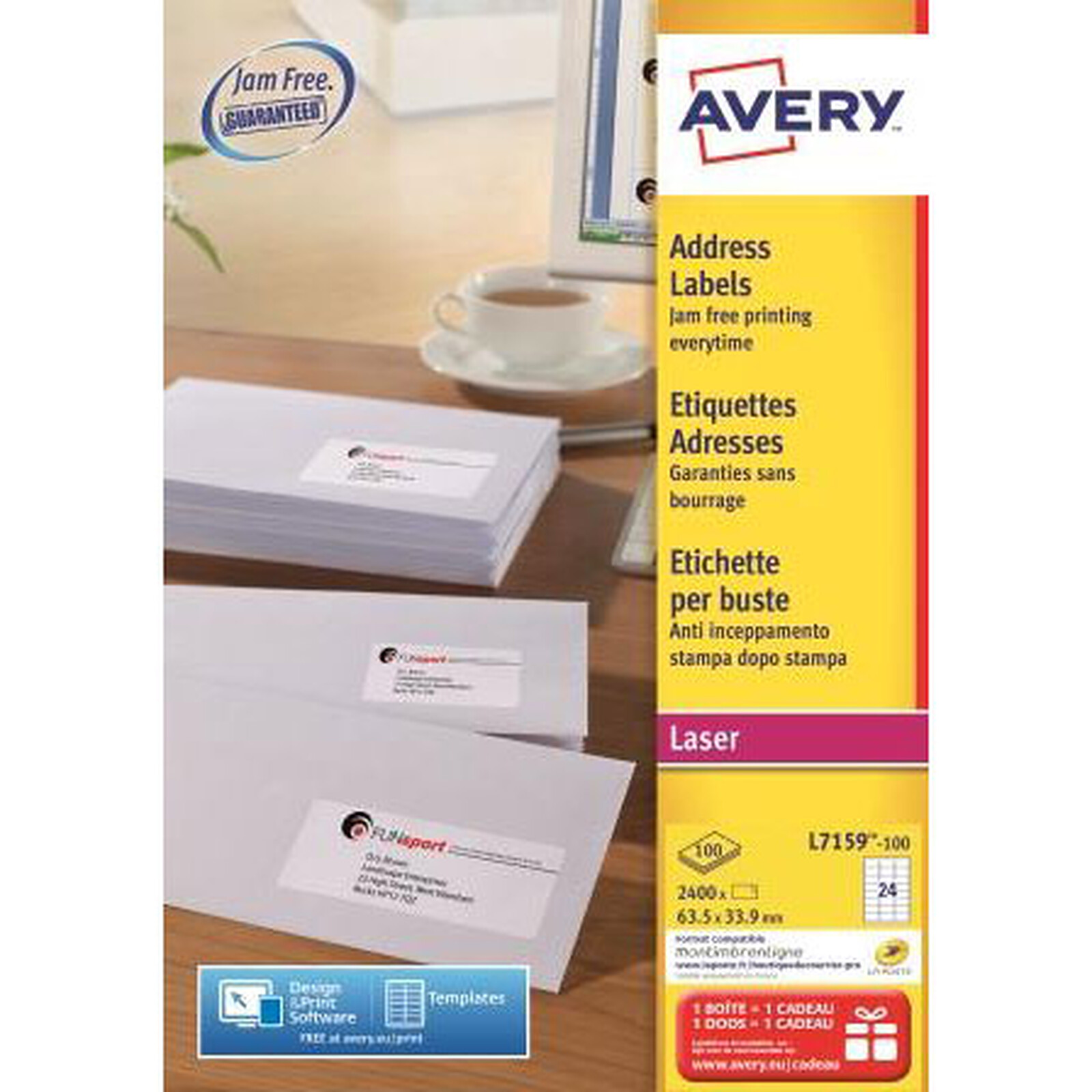 Les mailing et publipostages sont plus rapides grâce aux étiquettes adresses laser "Faciles à décoller de la planche" : vous séparez la feuille en colonnes afin d'exposer le bord des étiquettes que vous décollez ainsi plus rapidement. Les étiquettes adresses laser Avery sont garanties sans bourrage et certifiées FSC (issues de forêts gérées durablement). Ces étiquettes sont parfaites pour les enveloppes format DL.