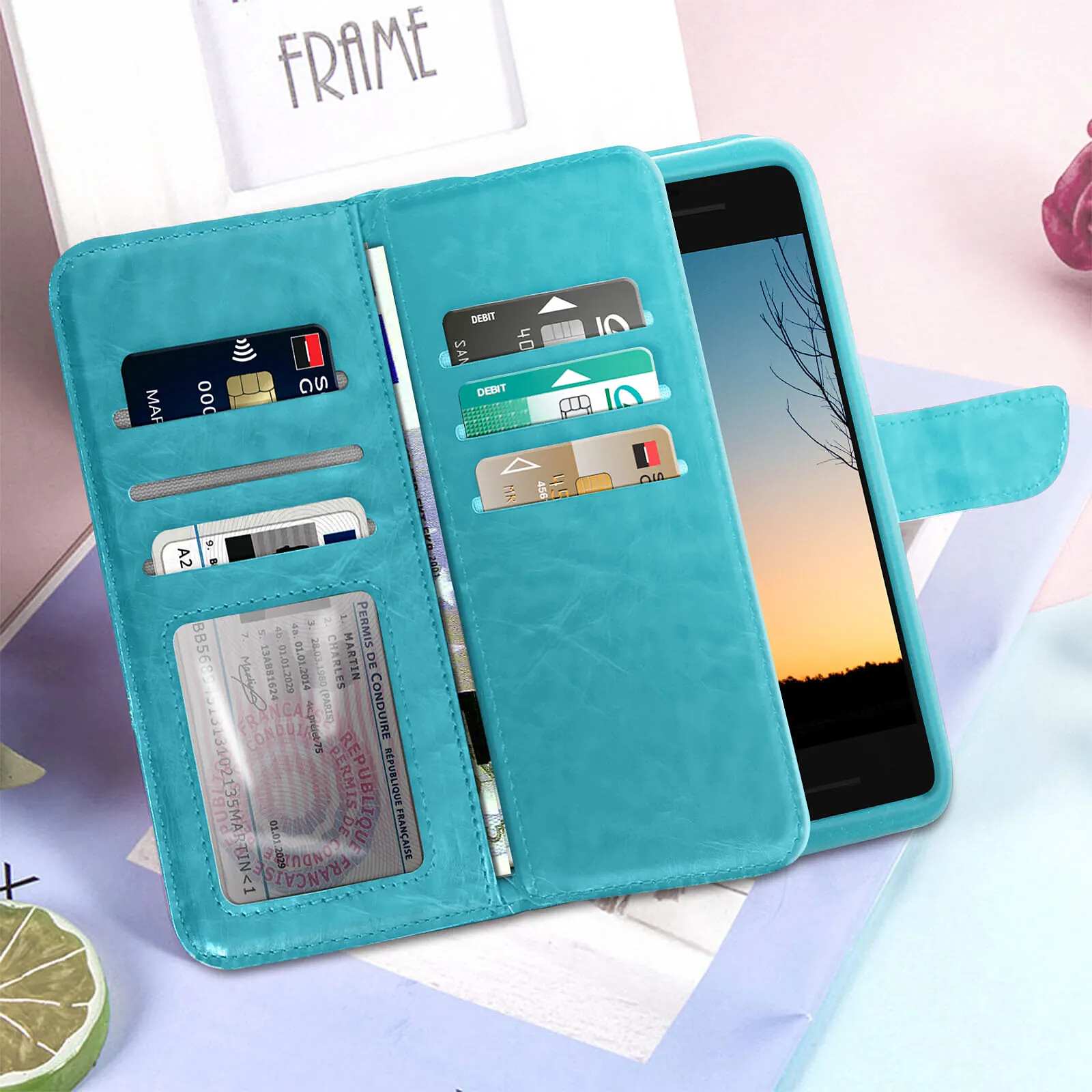Avizar Etui Smartphone 4,3 à 4,7'' Portefeuille Mutirangements Caméra Slide turquoise |