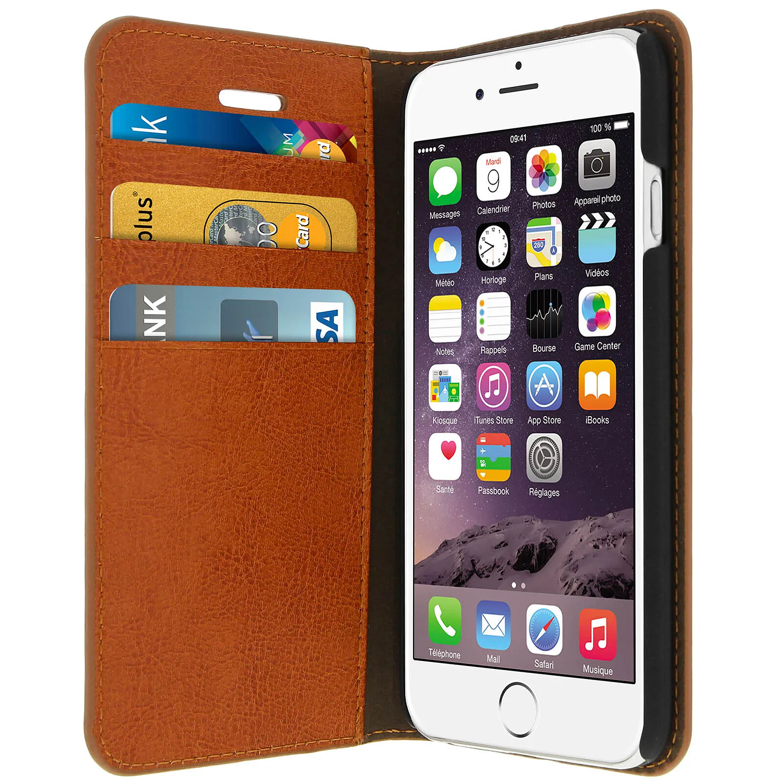 Housse à clapet portefeuille en cuir graine, fonction support pour Apple iPhone 6 et 6s. Revêtement en cuir véritable surpique et coque de maintien rigide sur-mesure. Compartiments pour cartes et poche latérale. Toutes les fonctions sont accessibles.