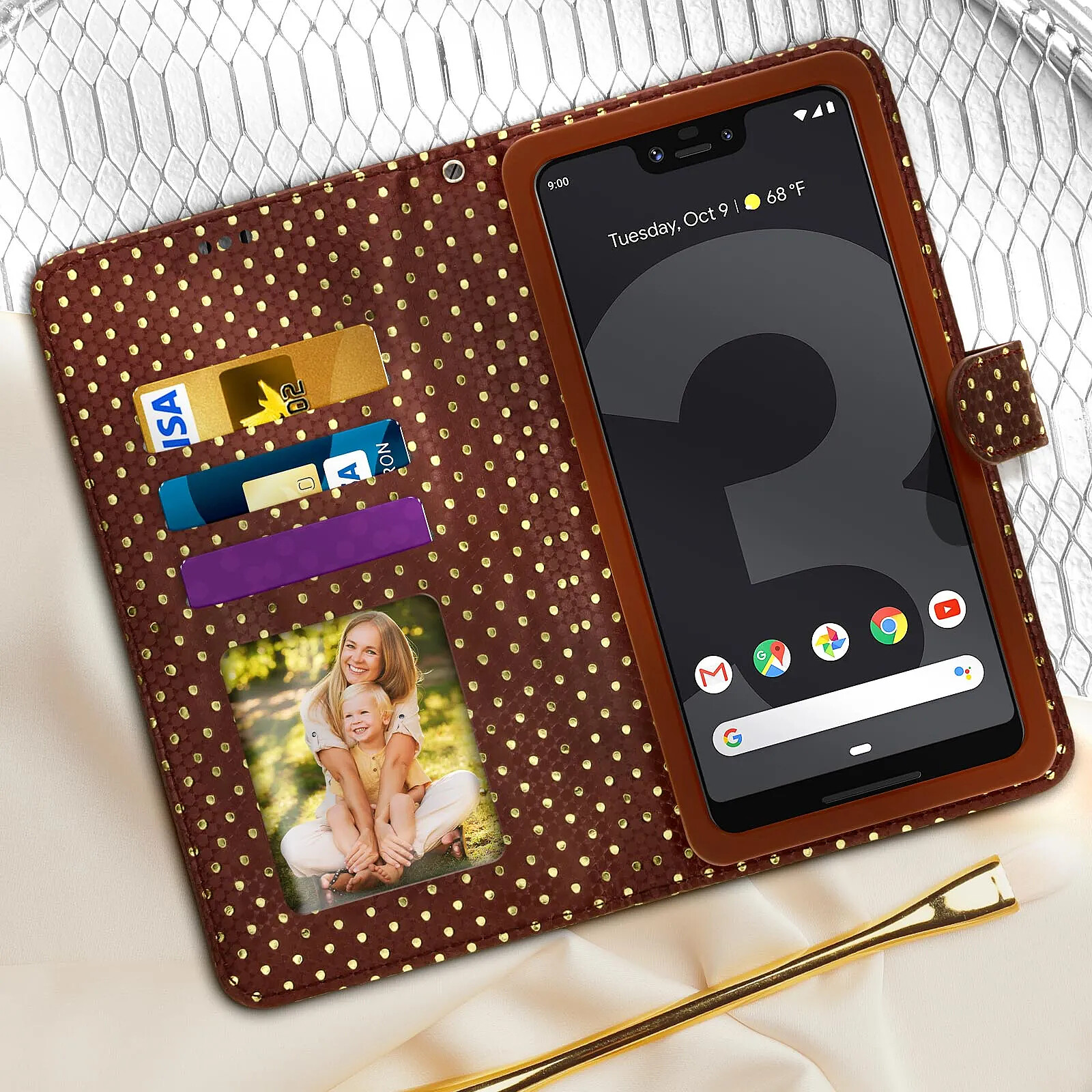 Housse portefeuille universelle pour smartphone (taille max 139 x 75 mm). Revêtement à pois en éco-cuir + coque silicone. Coque coulissante pour accéder à la caméra. 4 fentes pour cartes, dos se déplie en support bureau, miroir intégré. Dragonne incluse