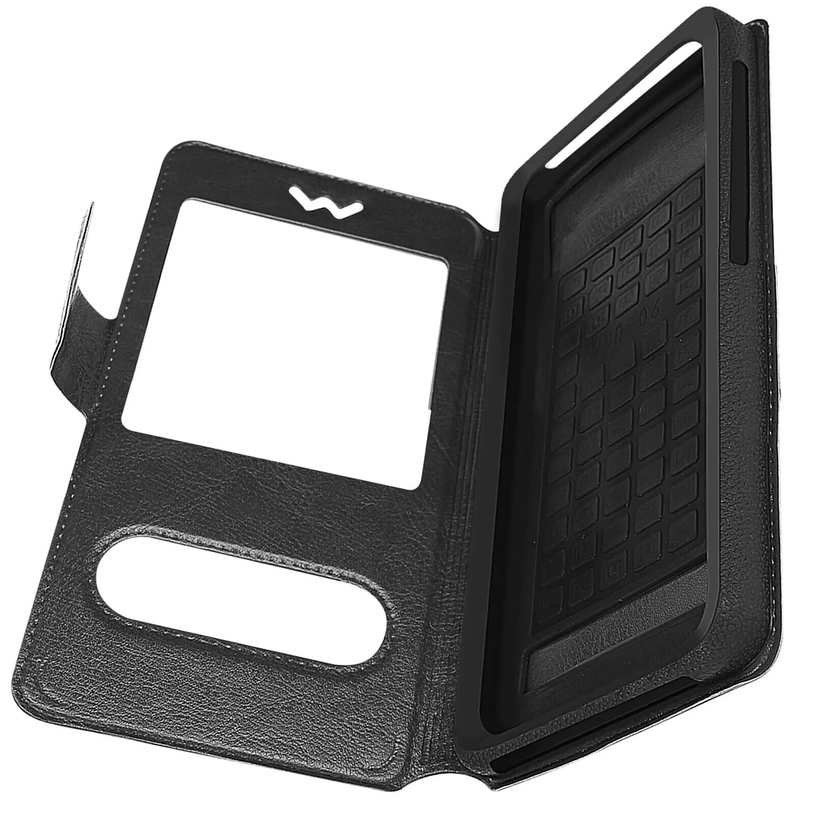 Étui folio universel à double fenêtres avec languette magnétique pour appareil. Fenêtre d'affichage transparente pour garder en vue l'écran Fenêtre de décrochage rapide pour contrôler les appels Regardez confortablement les photos vidéos grâce à la fonction support
