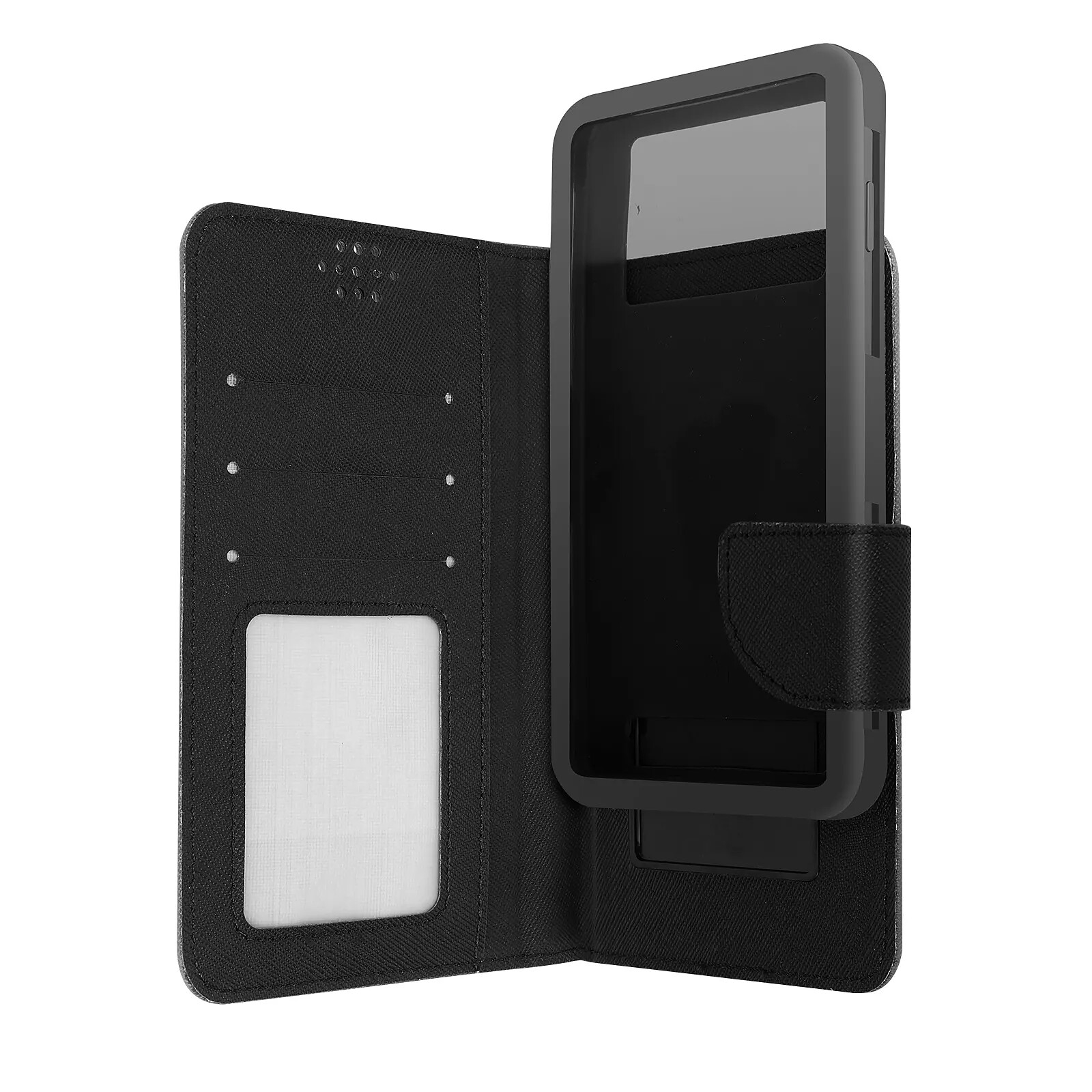 Housse universelle à clapet en simili cuir texturé pour smartphone de taille maximum 142 x 72 mm. Le clapet intègre 2 rangements pour cartes et une pochette latérale pour billets. Fonction coulissante pour libérer la caméra. Fonctionnalités accessibles.