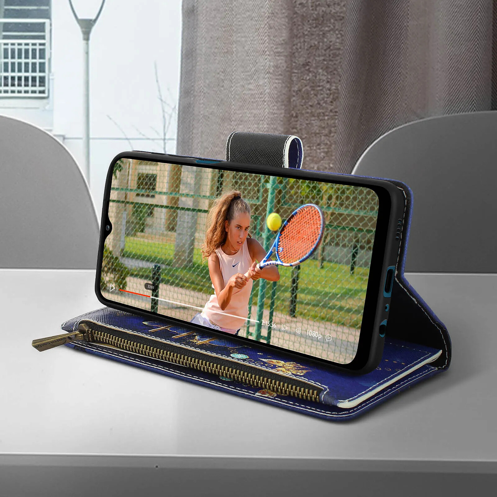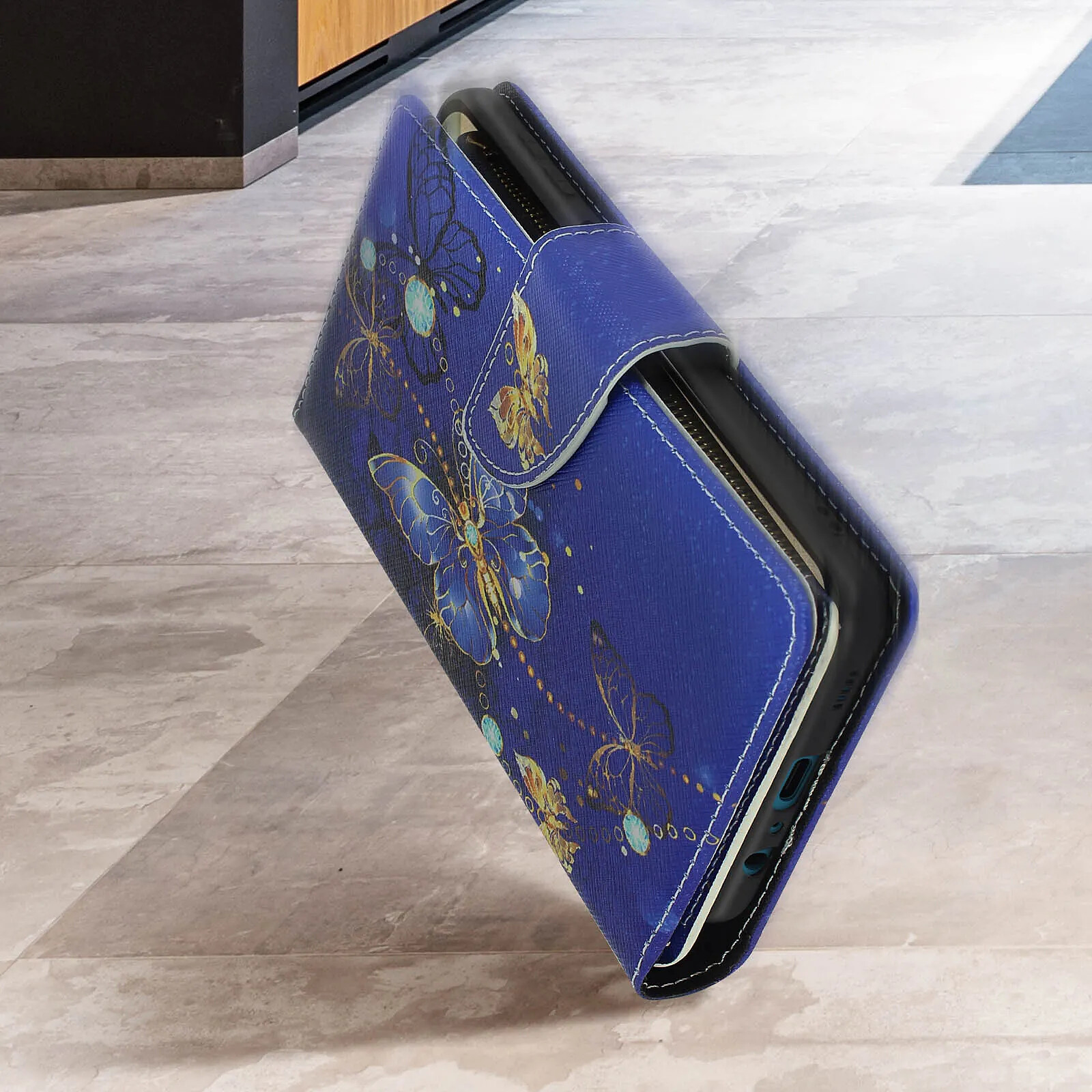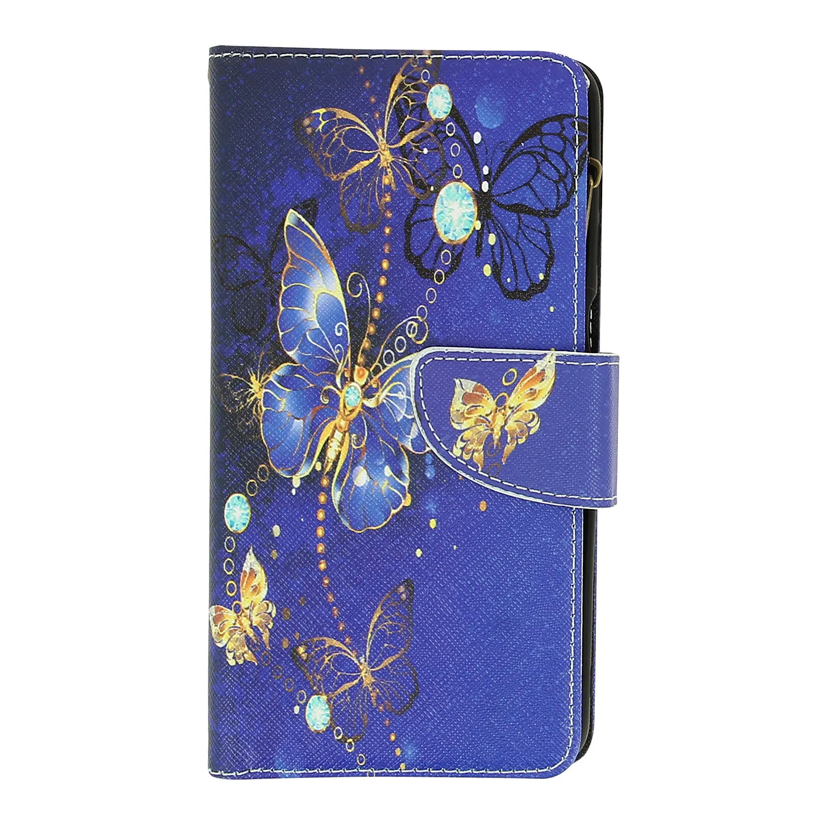Étui Samsung Galaxy A12 à motif papillons Or. Il protège votre mobile dans son intégralité tout en lui procurant un look unique. Espaces de rangement intégrés pour vos cartes et une poche zippée pour vos billets. Fonction support vidéo. Dragonne incluse.