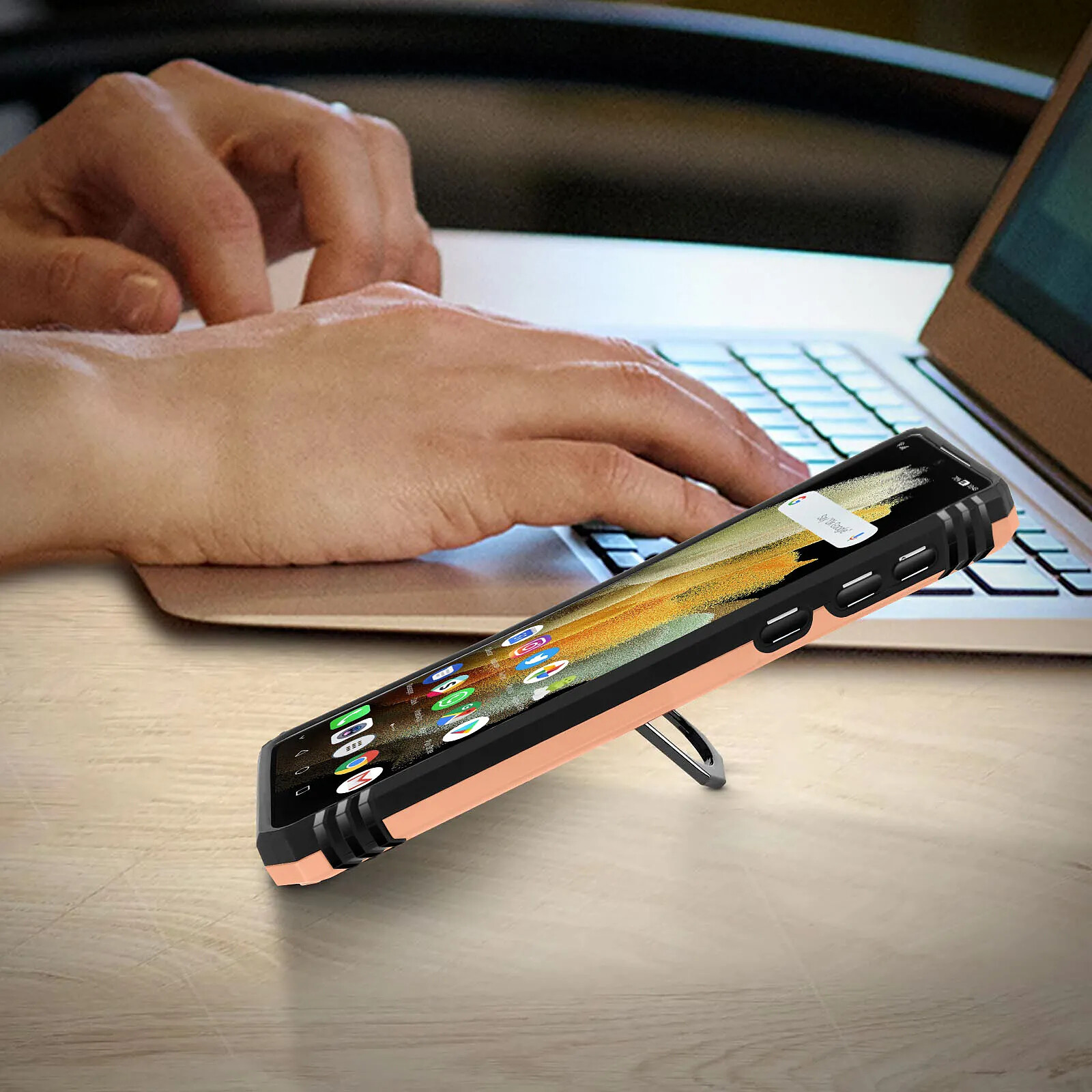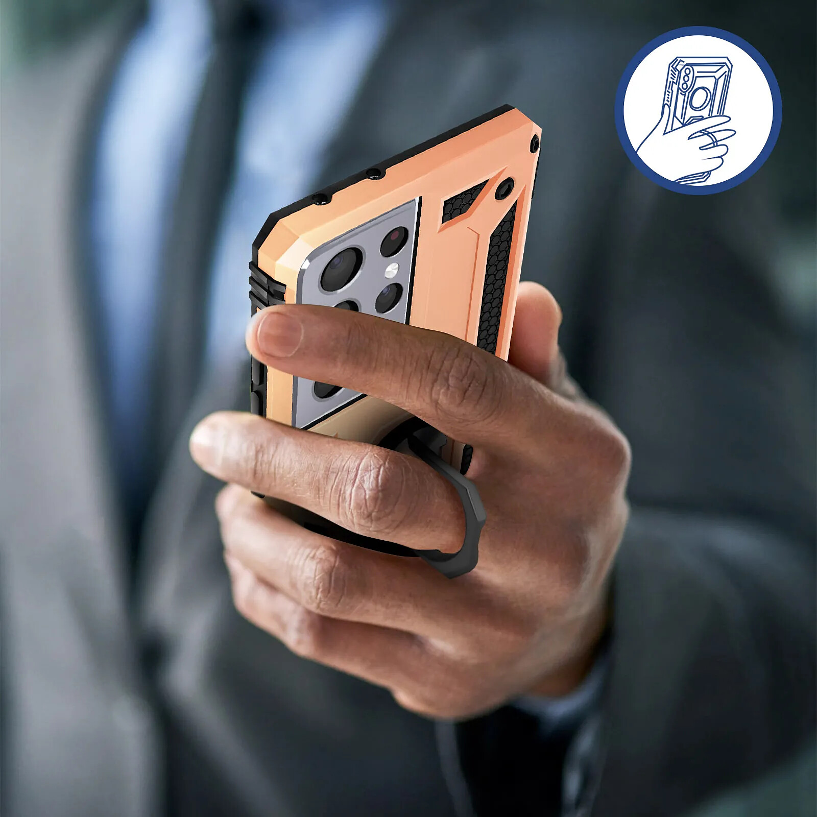 Coque antichoc bi-matière pour Samsung Galaxy S21 Ultra. Armature rigide et intérieur en silicone. Bague de maintien pouvant se transformer en support vidéo. Compatible avec un support magnétique. Fonctionnalités accessibles.