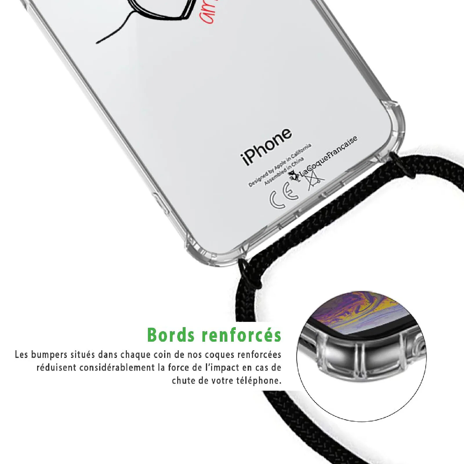 CORDON ULTRA PRATIQUE : Protectrice, cette coque est également très pratique grâce à son cordon. Accessoire très tendance, le cordon permet de garder votre smartphone toujours dispo ! Suspendu autour du cou ou en bandoulière, votre smartphone est toujours à portée de main !