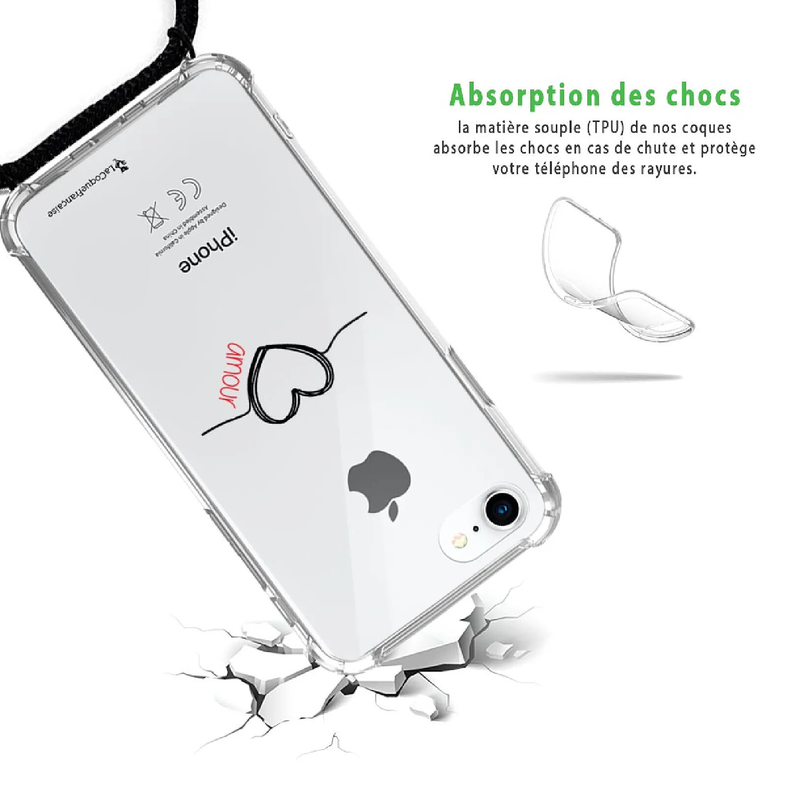 LaCoqueFrançaise Coque cordon iPhone 7/8/ iPhone SE 2020 noir Dessin Coeur Noir Amour