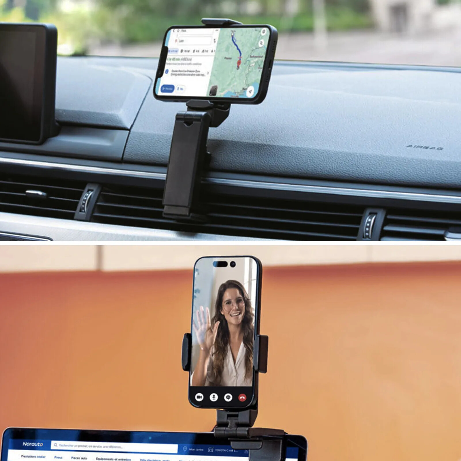 Support multifonction pour telephone, utilisable sur bureau, sur grille d'aeration de voiture ou encore sur une etagere. Rotation 360° pour faire pivoter a souhait le support. Design compact avec rangement et transport facilités. Base anti derapante.
