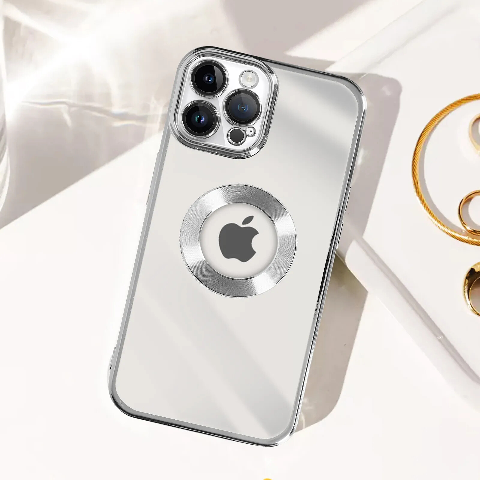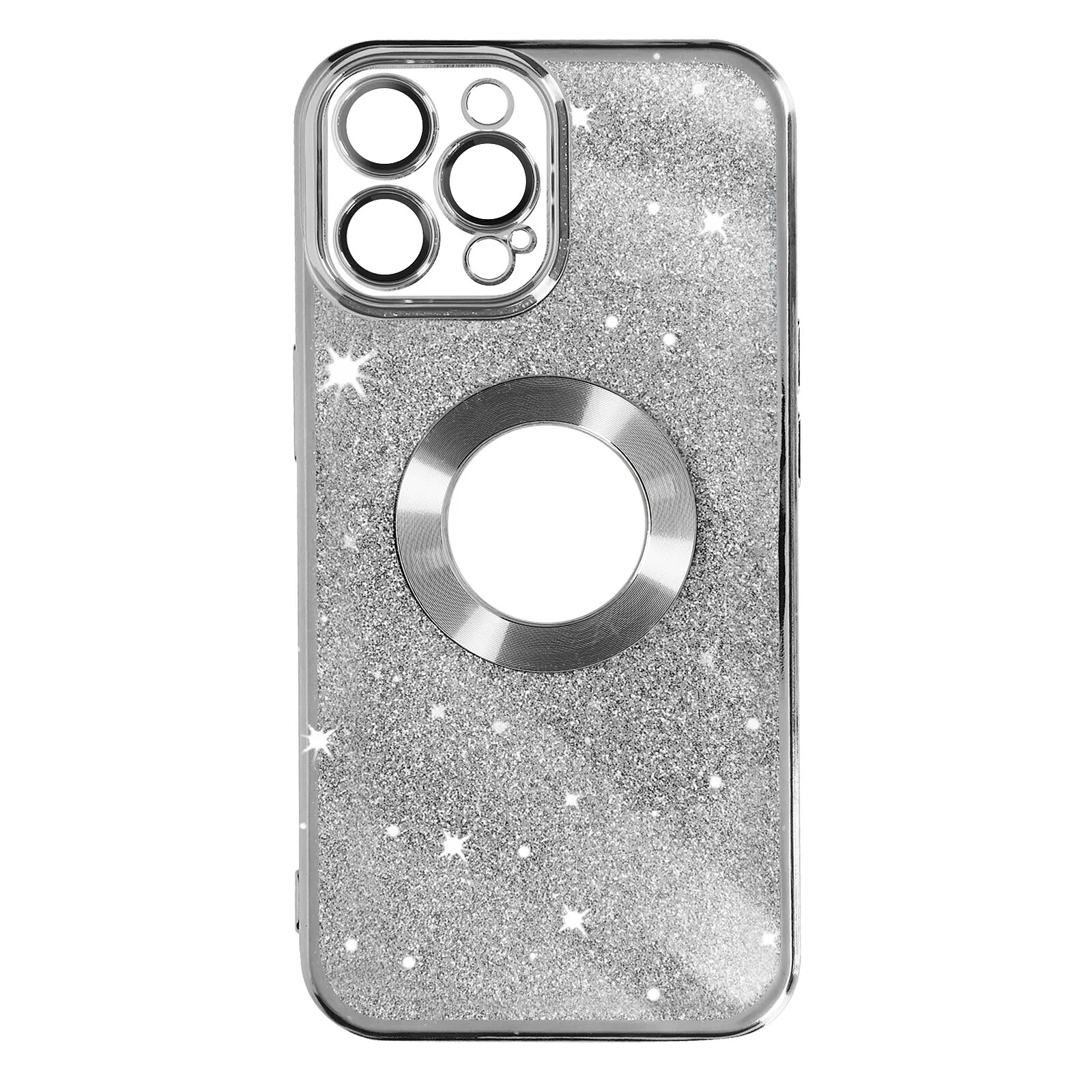Coque pour iPhone 13 Pro Max, série Protecam Spark. Design pailleté avec contour chromé pour une touche de brillance. Feuille pailletée amovible. Matériau en silicone gel avec caméra entièrement protégée. Fine et légère. Fonctions accessibles.