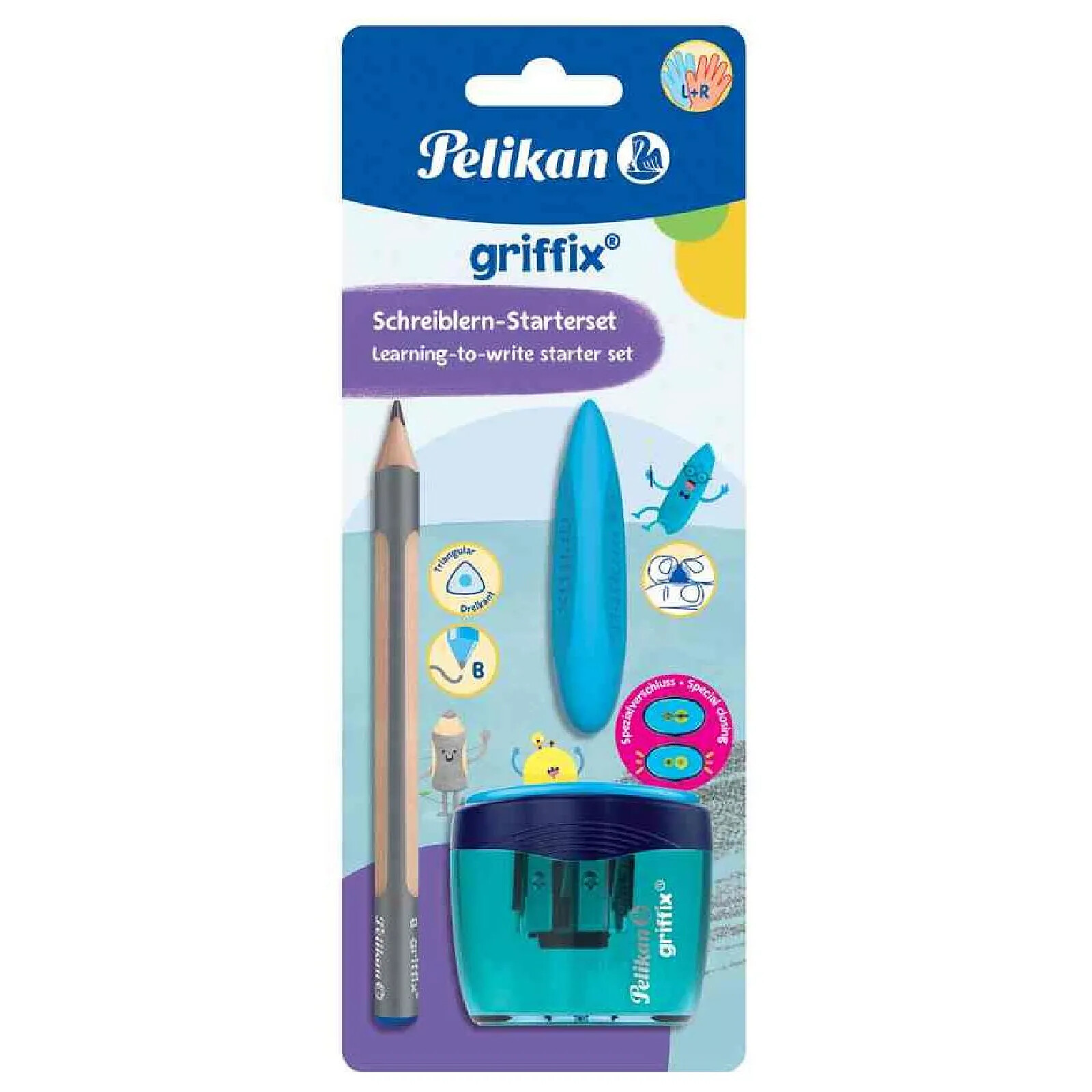 Kit d''apprentissage de l''écriture griffix®, sur carte blister • vendu uniquement au conditionnement Contenu : - 1 crayon d''apprentissage griffix, degré de dureté : B - 1 taille-crayon 2 trous griffix - 1 gomme triangulaire griffix