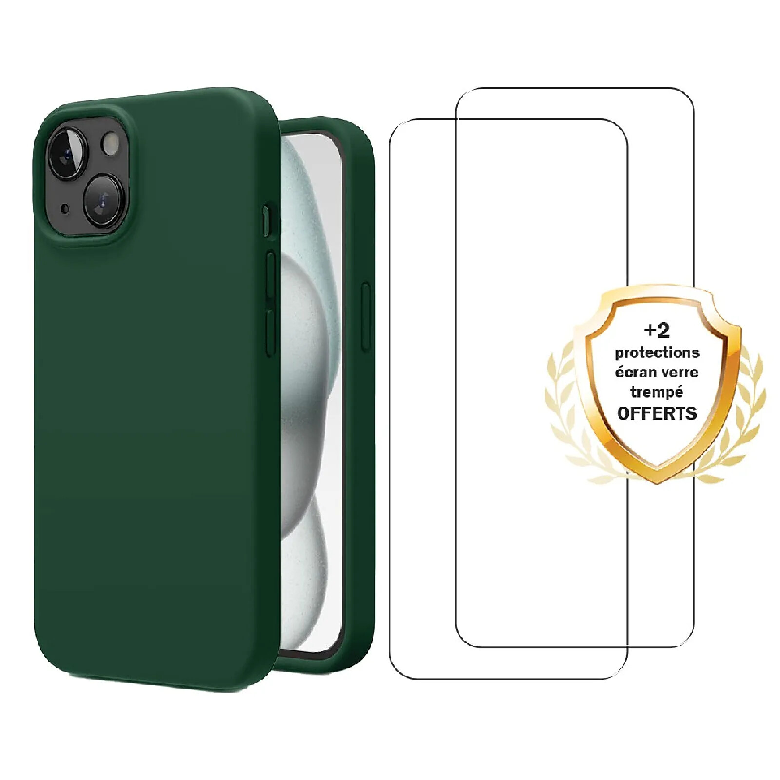 Coque iPhone 15 Silicone liquide Verte + 2 Vitres en Verre trempé Protection écran Antichocs