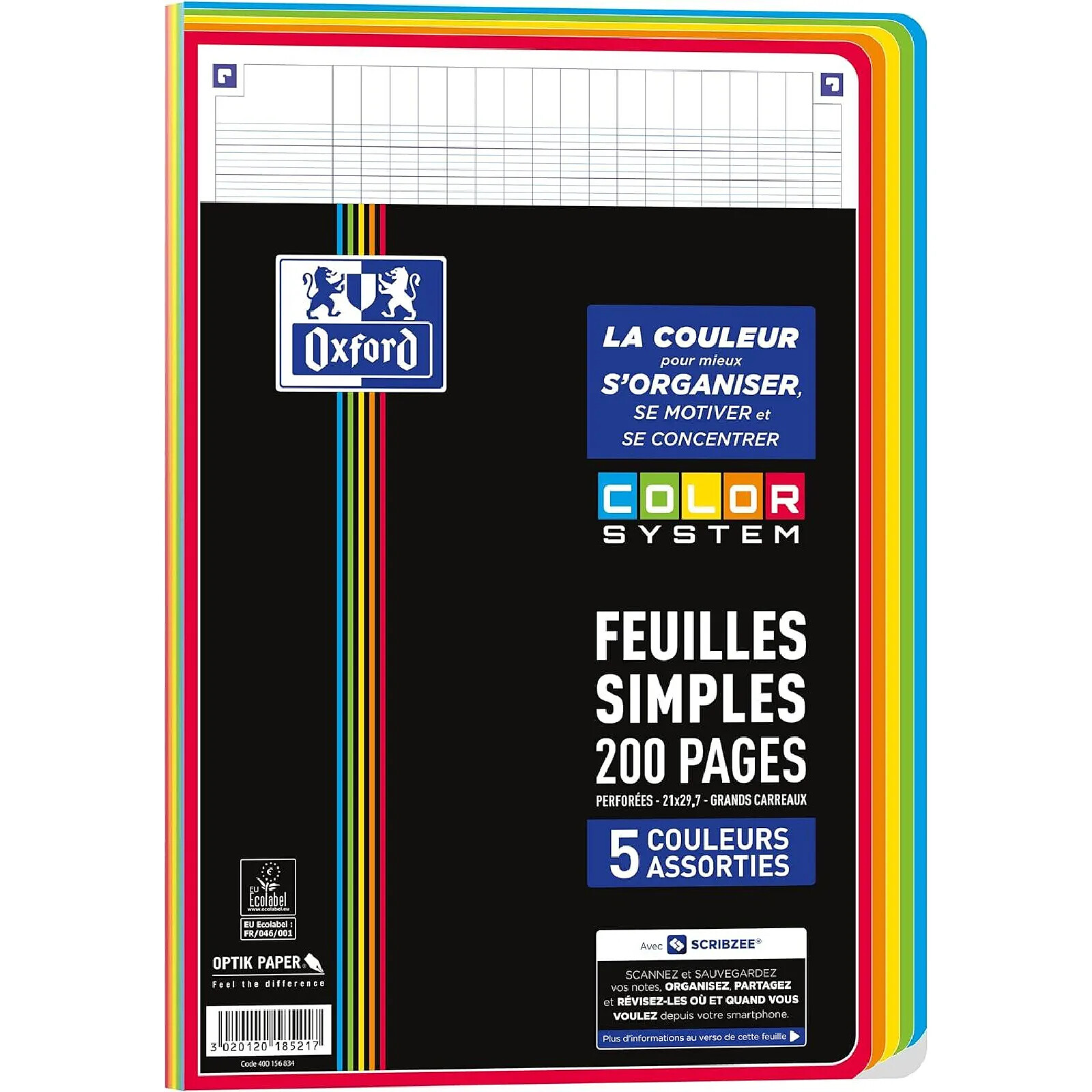 OXFORD Feuilles Simples COLOR SYSTEM A4 Perforées 200 pages Grands Carreaux 5 Couleurs |