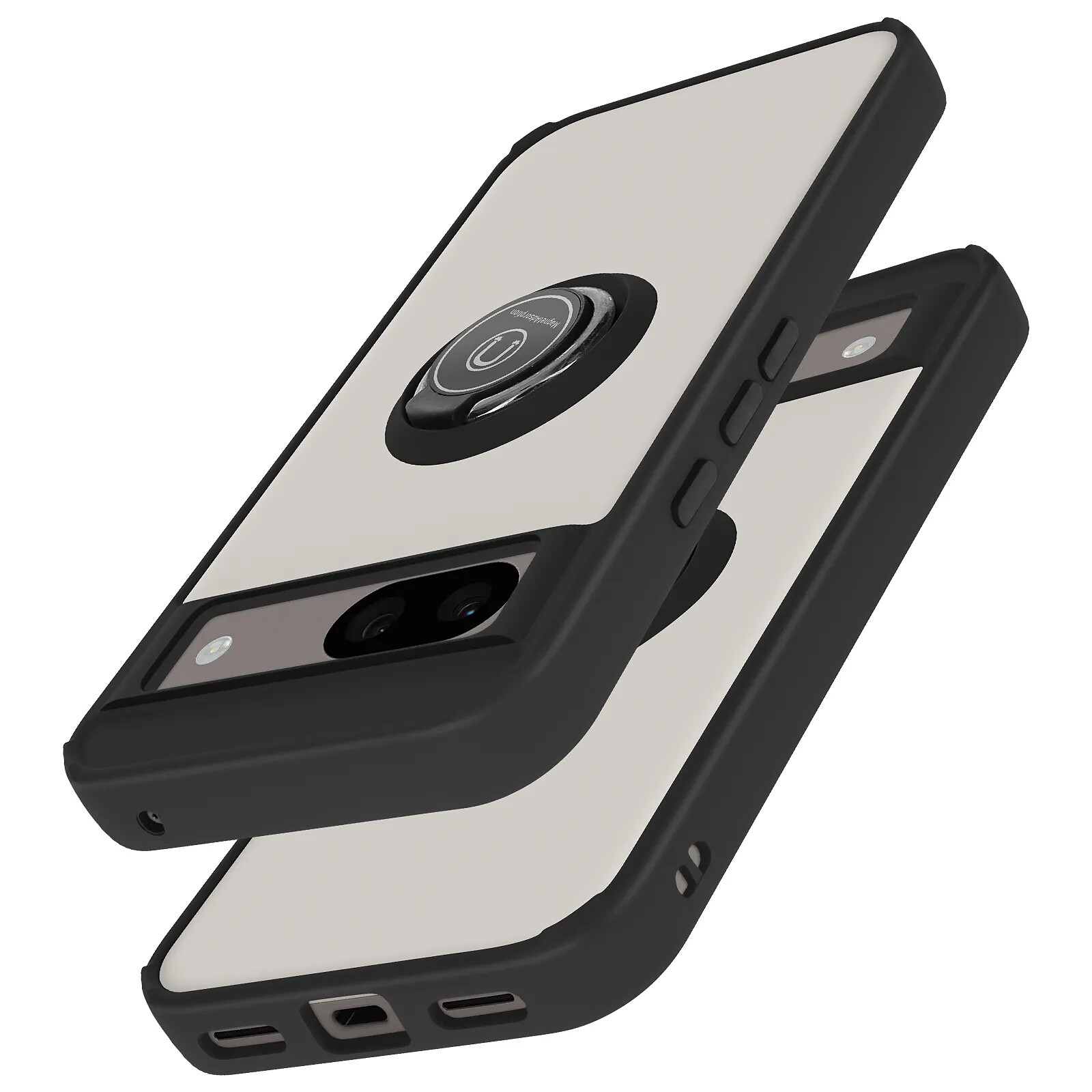 Coque Antichoc pour Google Pixel 8A. Conçue en polycarbonate + silicone gel. Bague de maintien pouvant se transformer en support. Finition métallique compatible avec un support magnétique. Dos transparent givré anti-traces. Fonctionnalités accessibles.