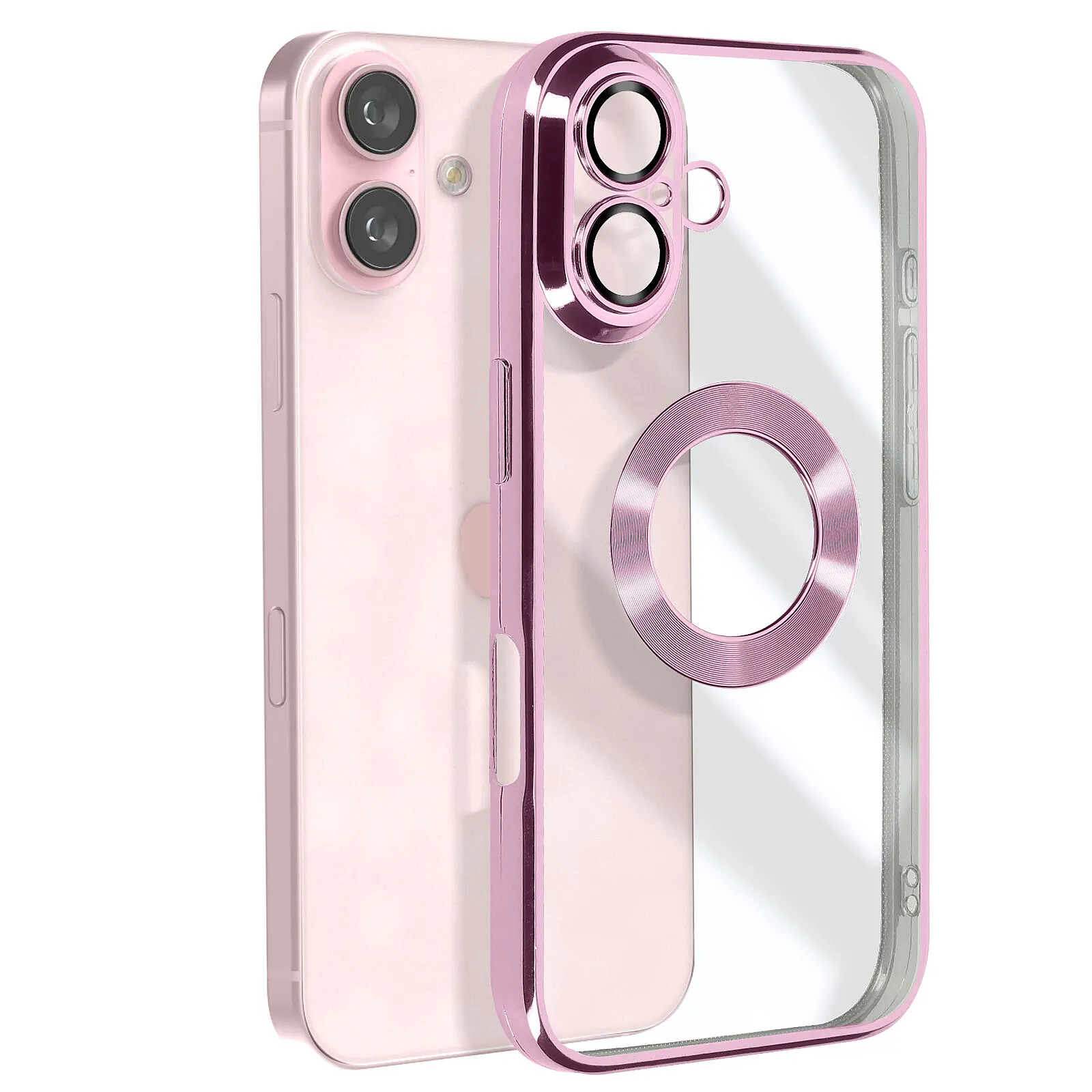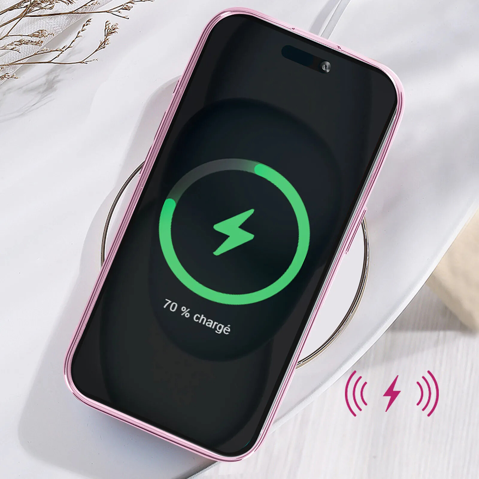 Coque Transparente au contour Rose série Glam, conçue pour appareil Conçue pour absorber les chocs et protéger le téléphone contre les chutes à faible hauteur et les impacts Bords surélevés qui protègent l'écran et la caméra en empêchant le contact direct avec les surfaces planes Compatible avec la charge sans fil