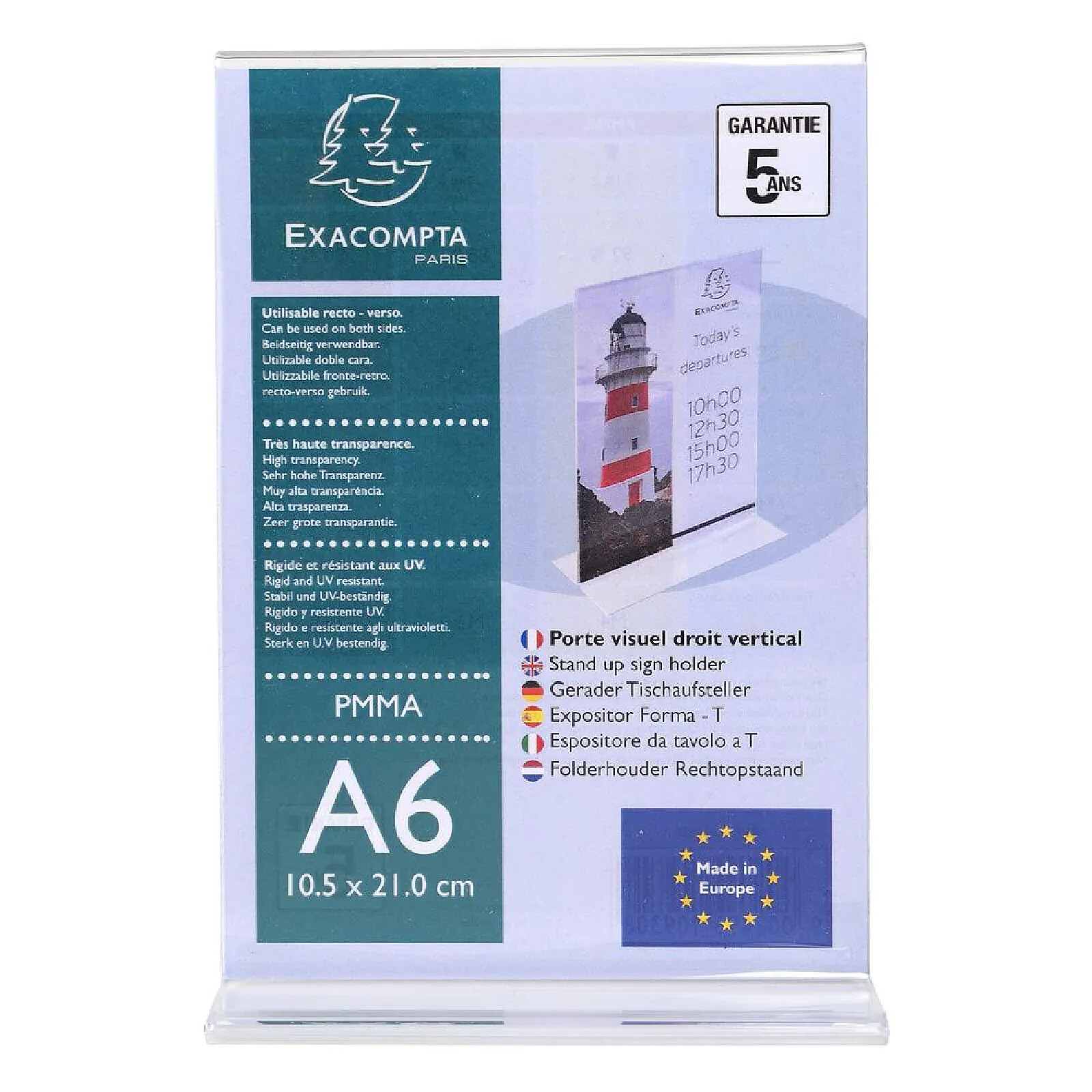 Porte-visuel droit vertical A6 Le porte-visuel droit vertical Exacompta est idéal pour afficher vos photos ou documents sur une table, bureau ou étagère. Fabriqué en PMMA (acrylique) de haute qualité avec une très haute transparence, il met en valeur votre visuel. Il est utilisable aussi bien verticalement qu'horizontalement grâce à sa base large. Fabriqué en Europe, il est garanti 5 ans et est résistant aux UV, il ne jaunit pas Vous pouvez facilement créer vos supports personnalisés et à la bonne taille avec KREAMAN sur www.exacompta.com
