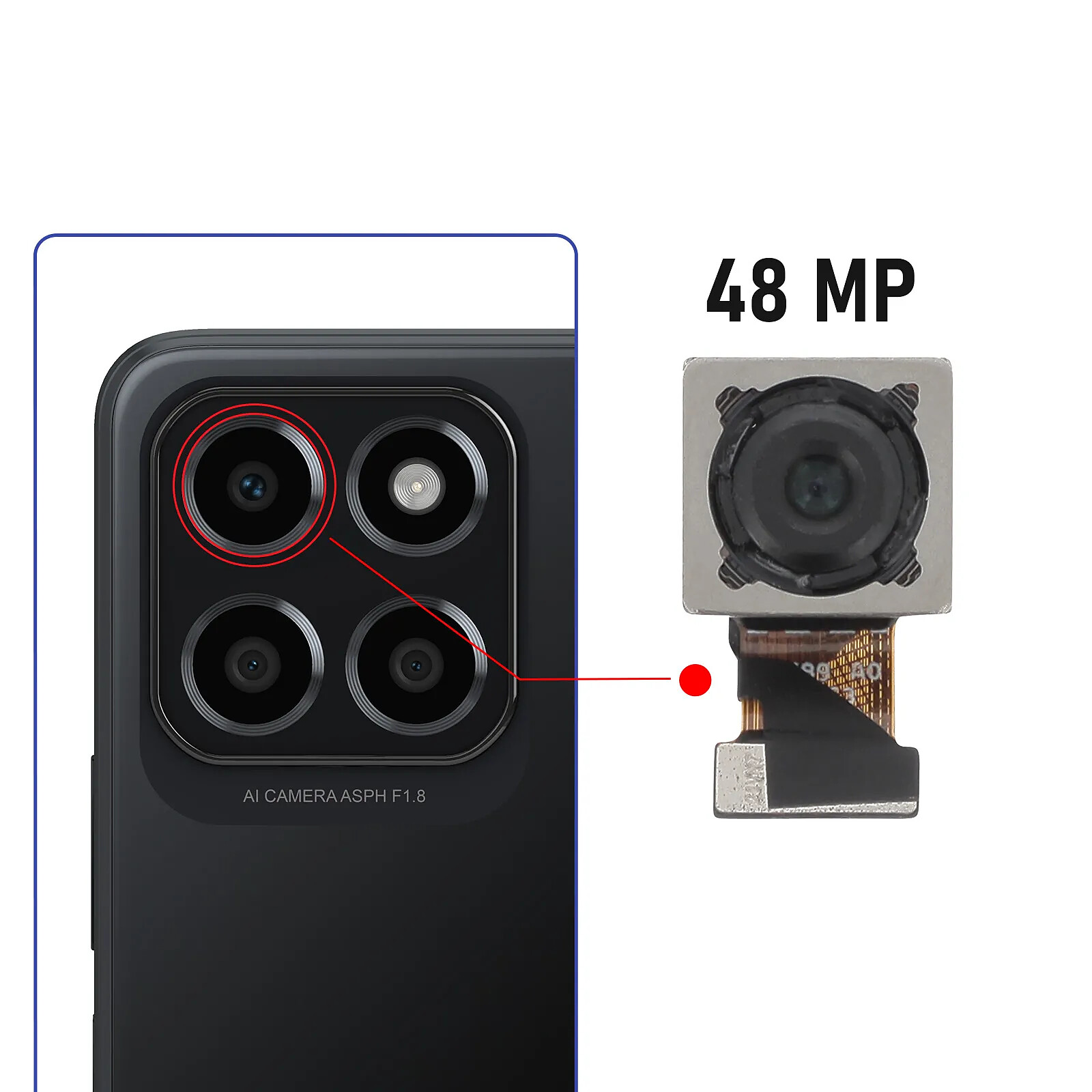 Caméra arrière de remplacement 48MP pour Honor X8 5G. Remplacez le capteur principal défectueux de votre téléphone et prenez des photos de qualité avec des détails impeccables. Compatible à 100%, nappe de connexion intégrée, prêt à installer.