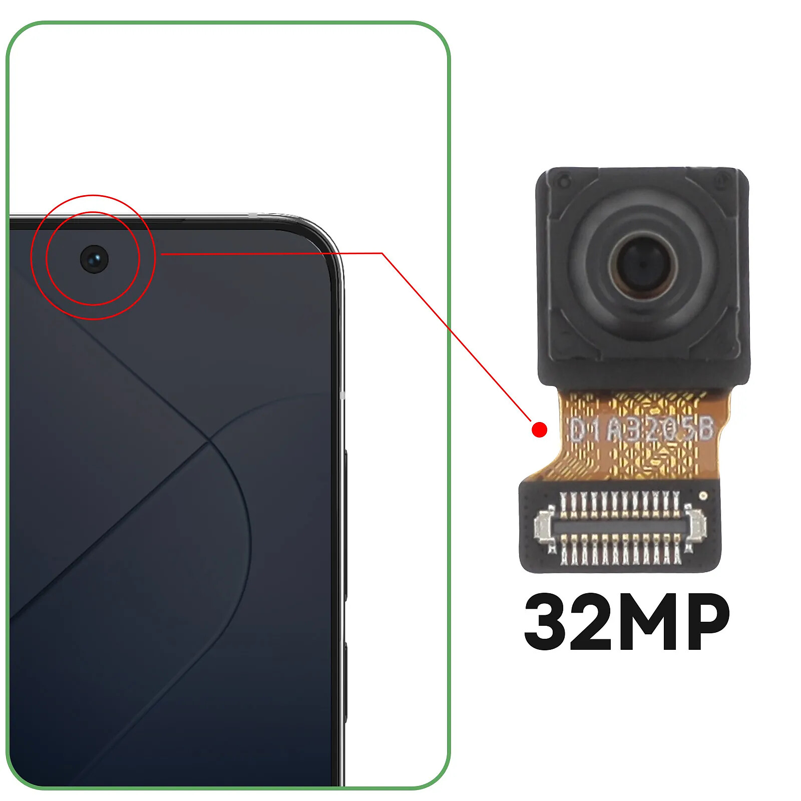 Caméra avant ReLife pour Xiaomi 14. Remplacez l'appareil photo cassé ou défectueux de votre smartphone et prenez des selfies réussis à nouveau. Module de caméra frontale 32MP avec nappe de connexion. Produit 100% neuf.