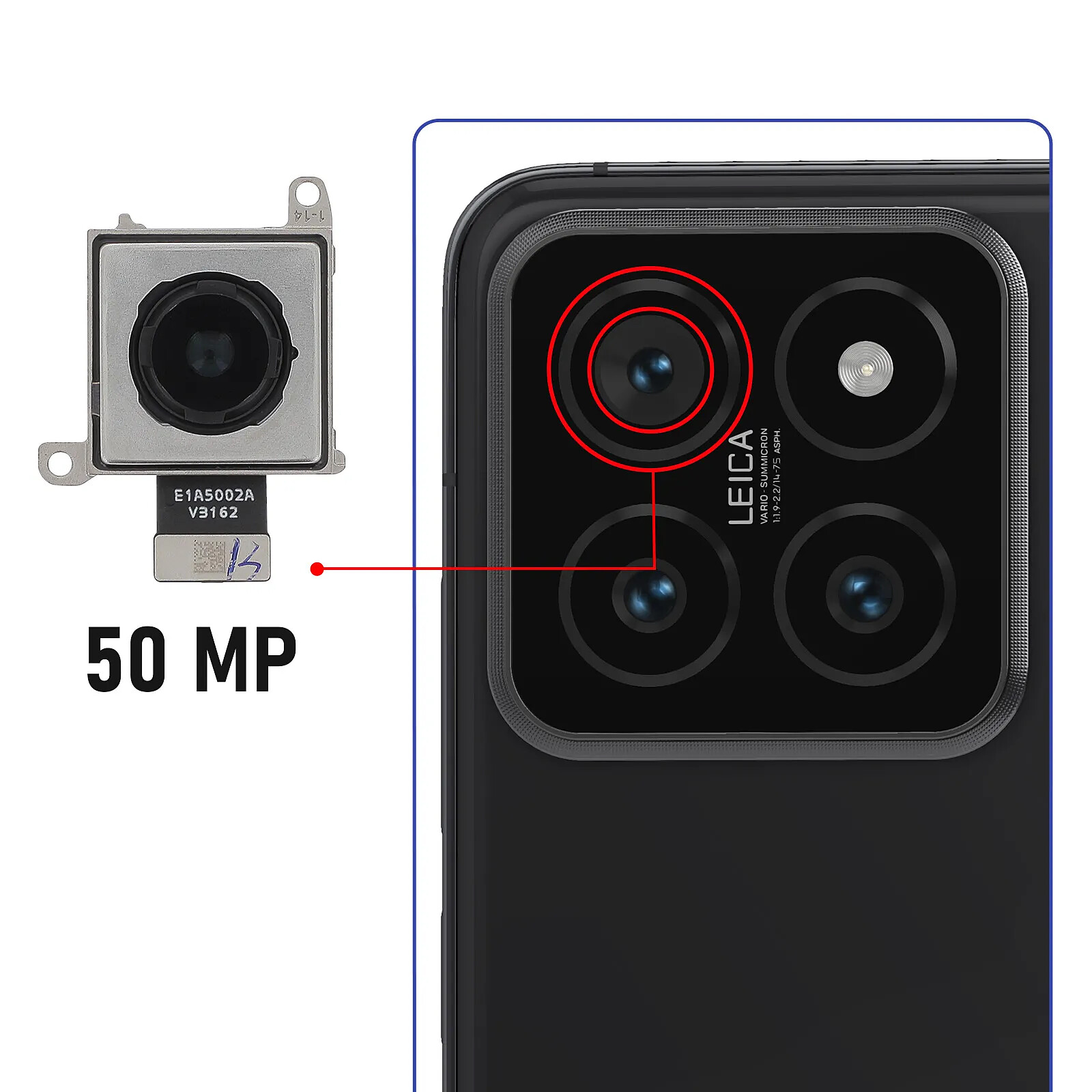 Caméra arrière de remplacement 50MP pour Xiaomi 14. Remplacez le capteur principal défectueux de votre téléphone et prenez des photos de qualité avec des détails impeccables. Compatible à 100%, nappe de connexion intégrée, prêt à installer.