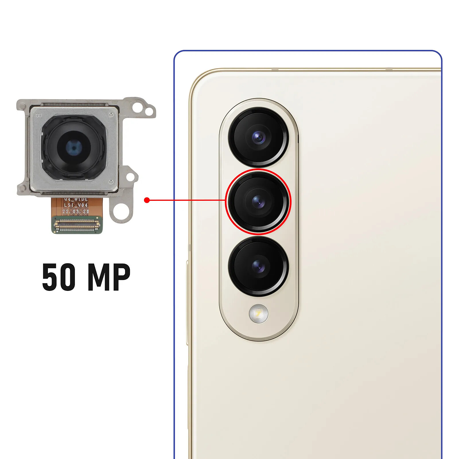 Caméra arrière de remplacement ReLife pour Samsung Galaxy Z Fold 4. Résolution 50MP. Remplacez le capteur principal défectueux de votre téléphone et prenez des photos de qualité avec des détails impeccables. Compatible à 100%, nappe de connexion intégrée, prêt à installer.